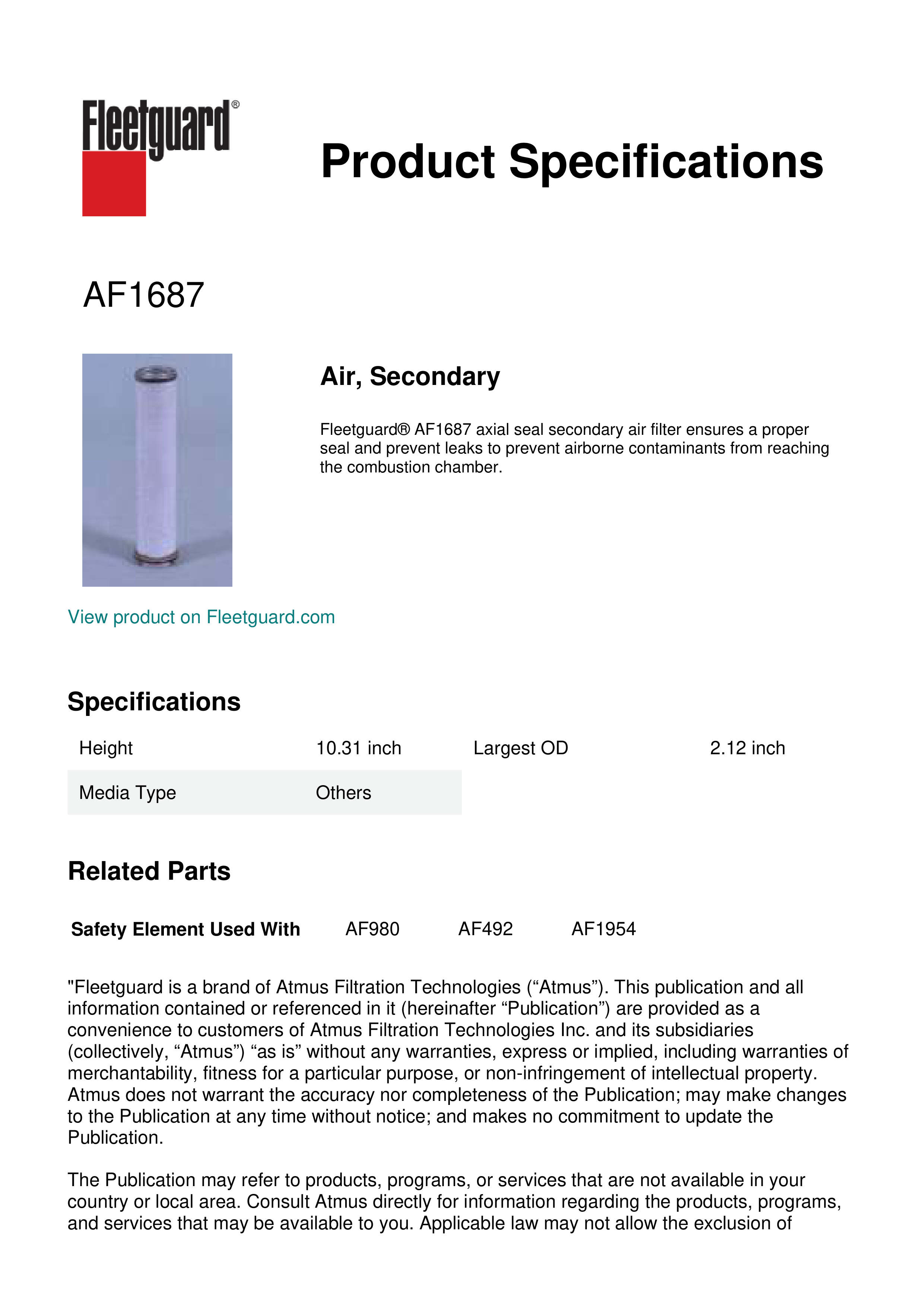 Fleetguard® AF1687 axial seal secondary air filter ensures a proper seal and prevent leaks to prevent airborne contaminants from reaching the combustion chamber.Specification