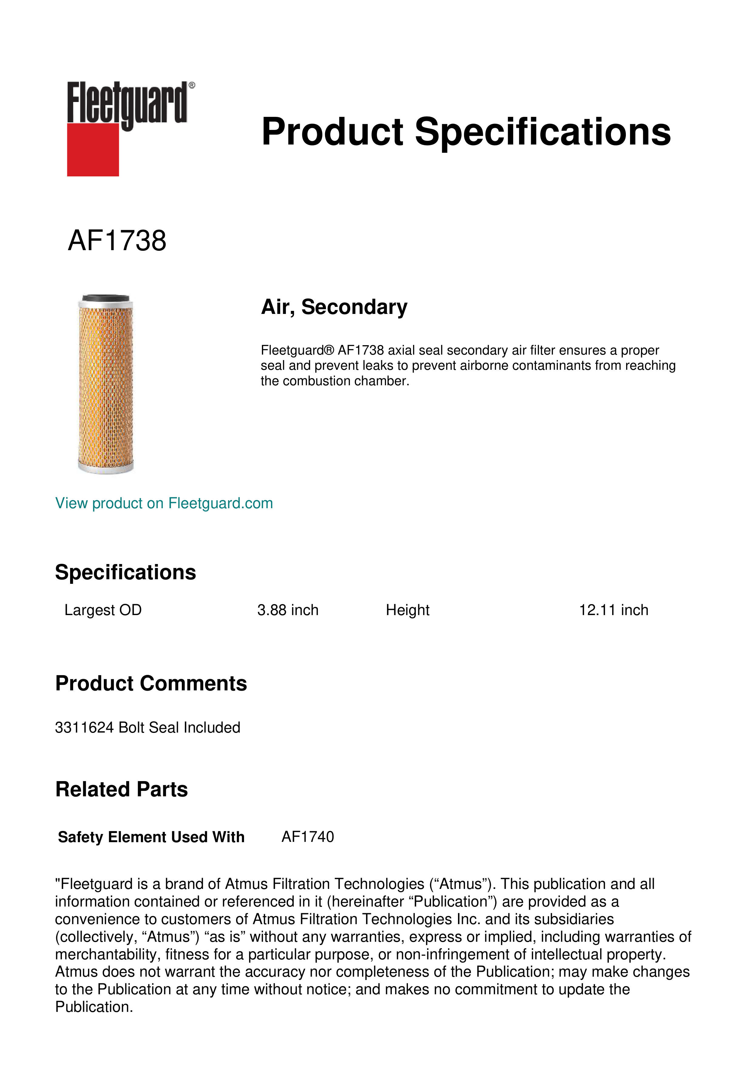 Fleetguard® AF1738 axial seal secondary air filter ensures a proper seal and prevent leaks to prevent airborne contaminants from reaching the combustion chamber.Specification