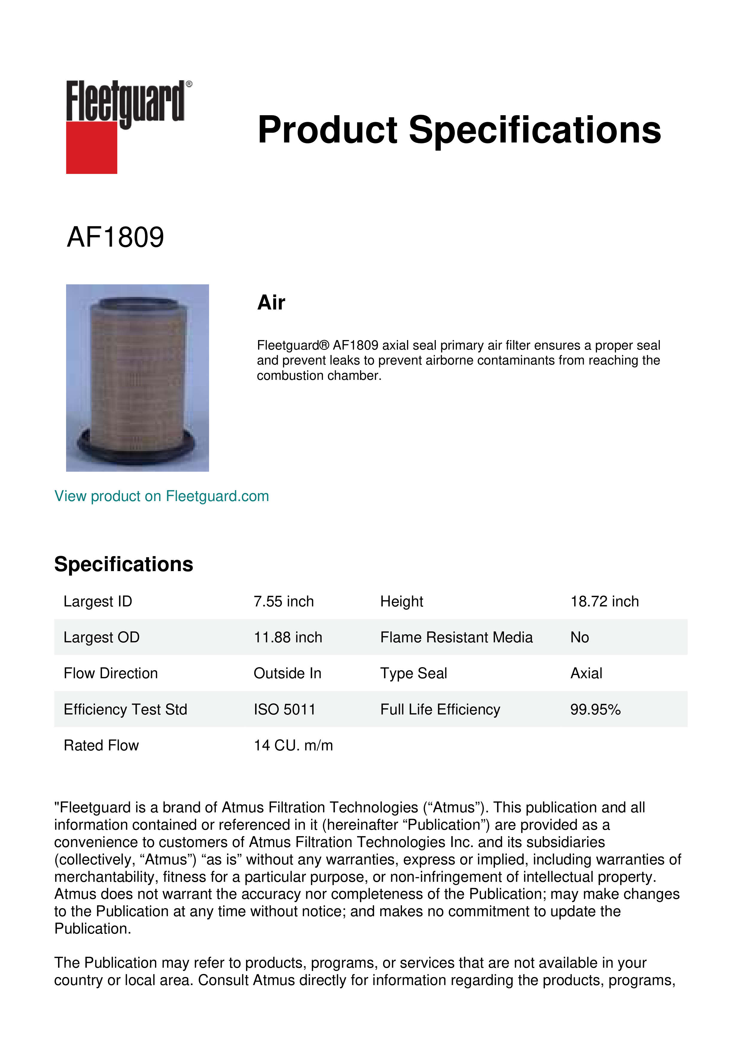 Fleetguard® AF1809 axial seal primary air filter ensures a proper seal and prevent leaks to prevent airborne contaminants from reaching the combustion chamber.