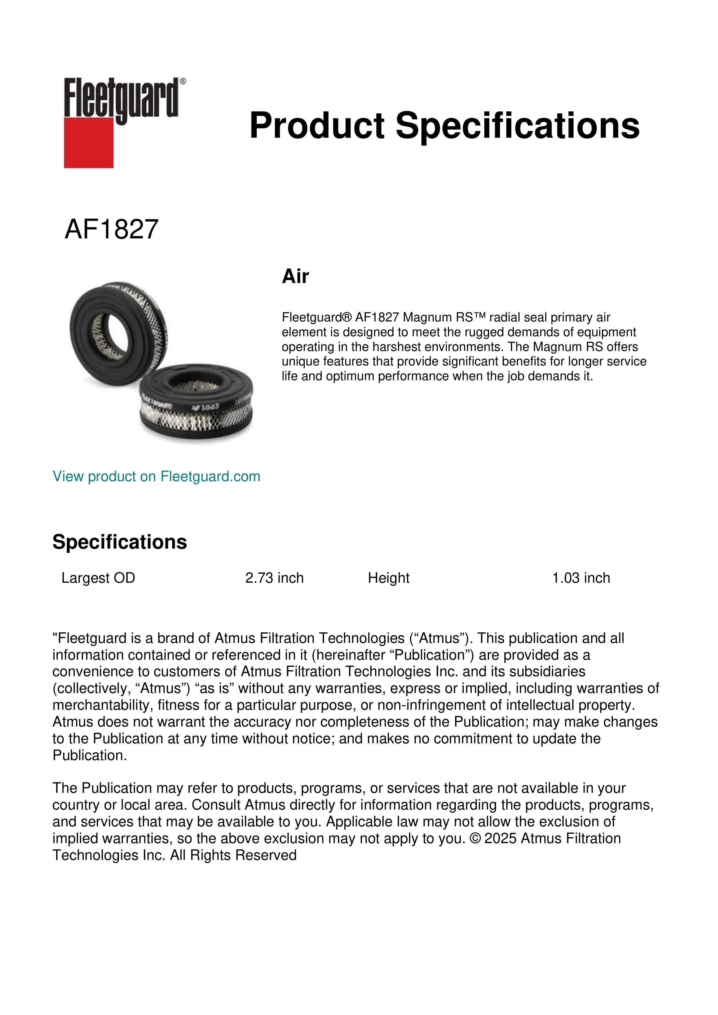 Fleetguard® AF1827 Magnum RS™ radial seal primary air element is designed to meet the rugged demands of equipment operating in the harshest environments. The Magnum RS offers unique features that provide significant benefits for longer service life and optimum performance when the job demands it.Specification