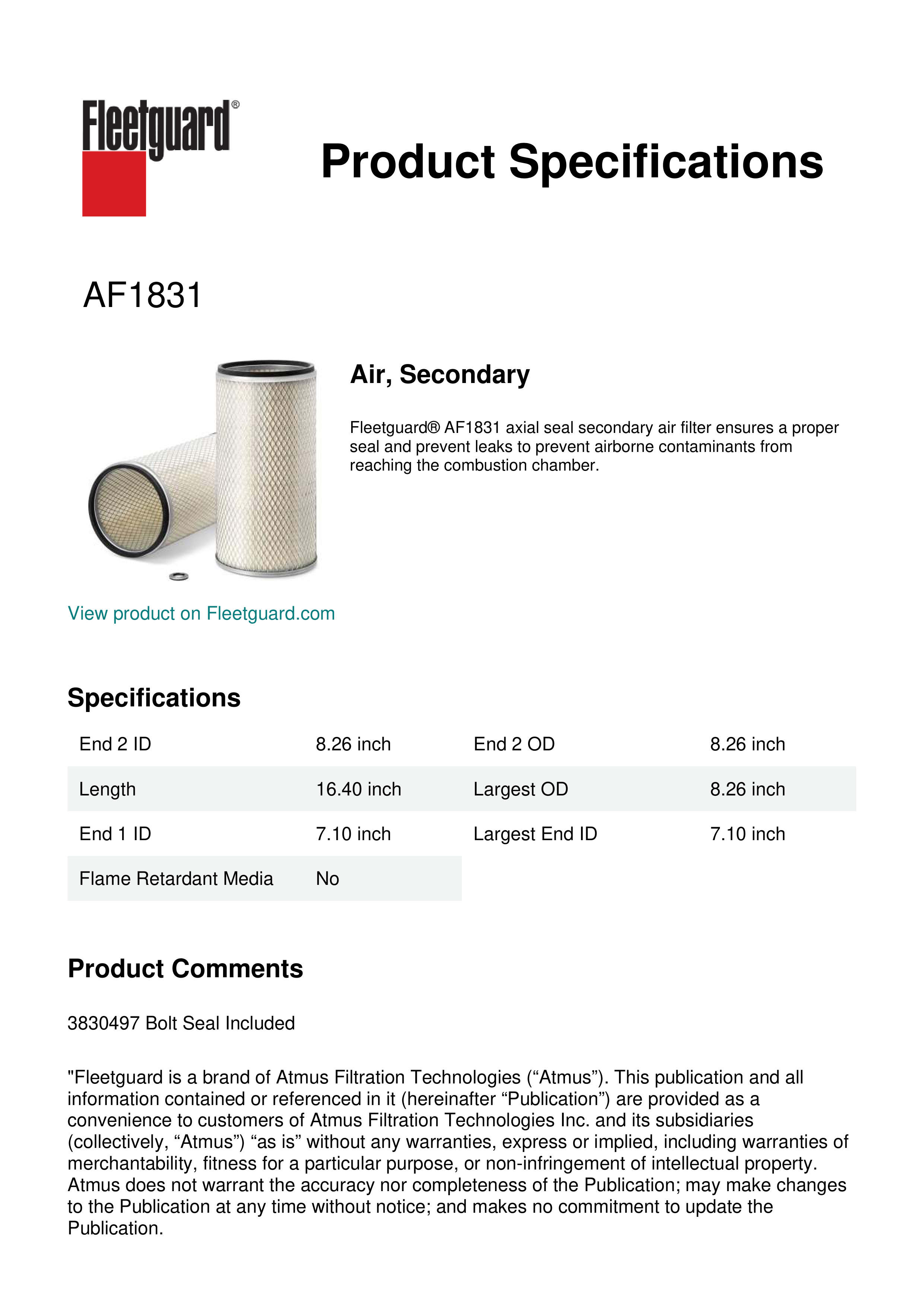 Fleetguard® AF1831 axial seal secondary air filter ensures a proper seal and prevent leaks to prevent airborne contaminants from reaching the combustion chamber.