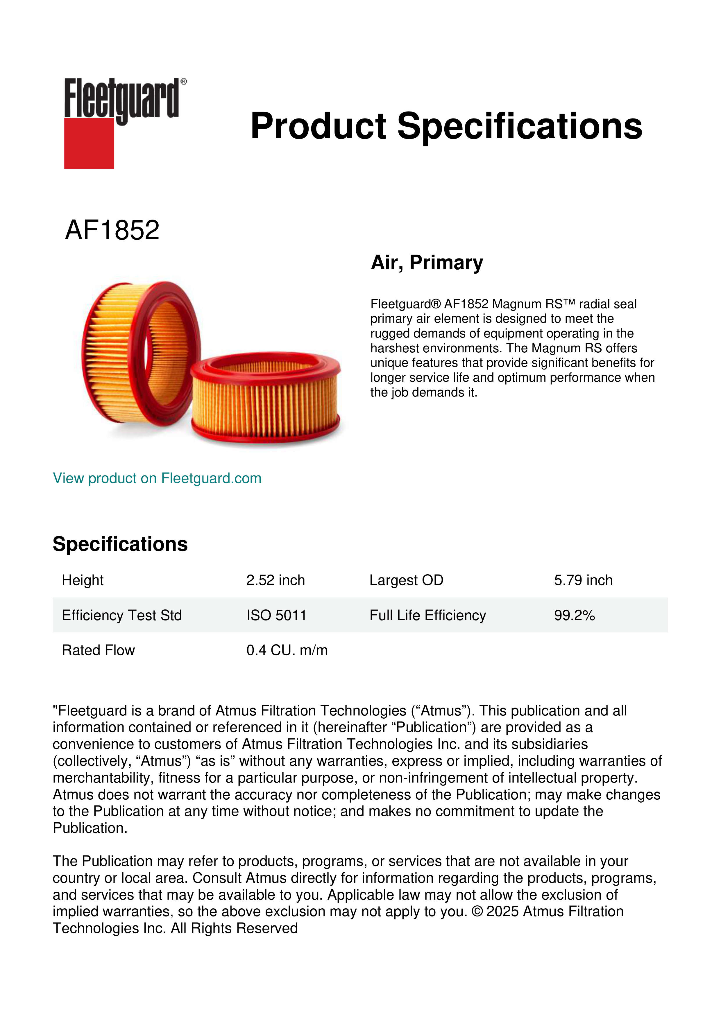 Fleetguard® AF1852 Magnum RS™ radial seal primary air element is designed to meet the rugged demands of equipment operating in the harshest environments. The Magnum RS offers unique features that provide significant benefits for longer service life and optimum performance when the job demands it.