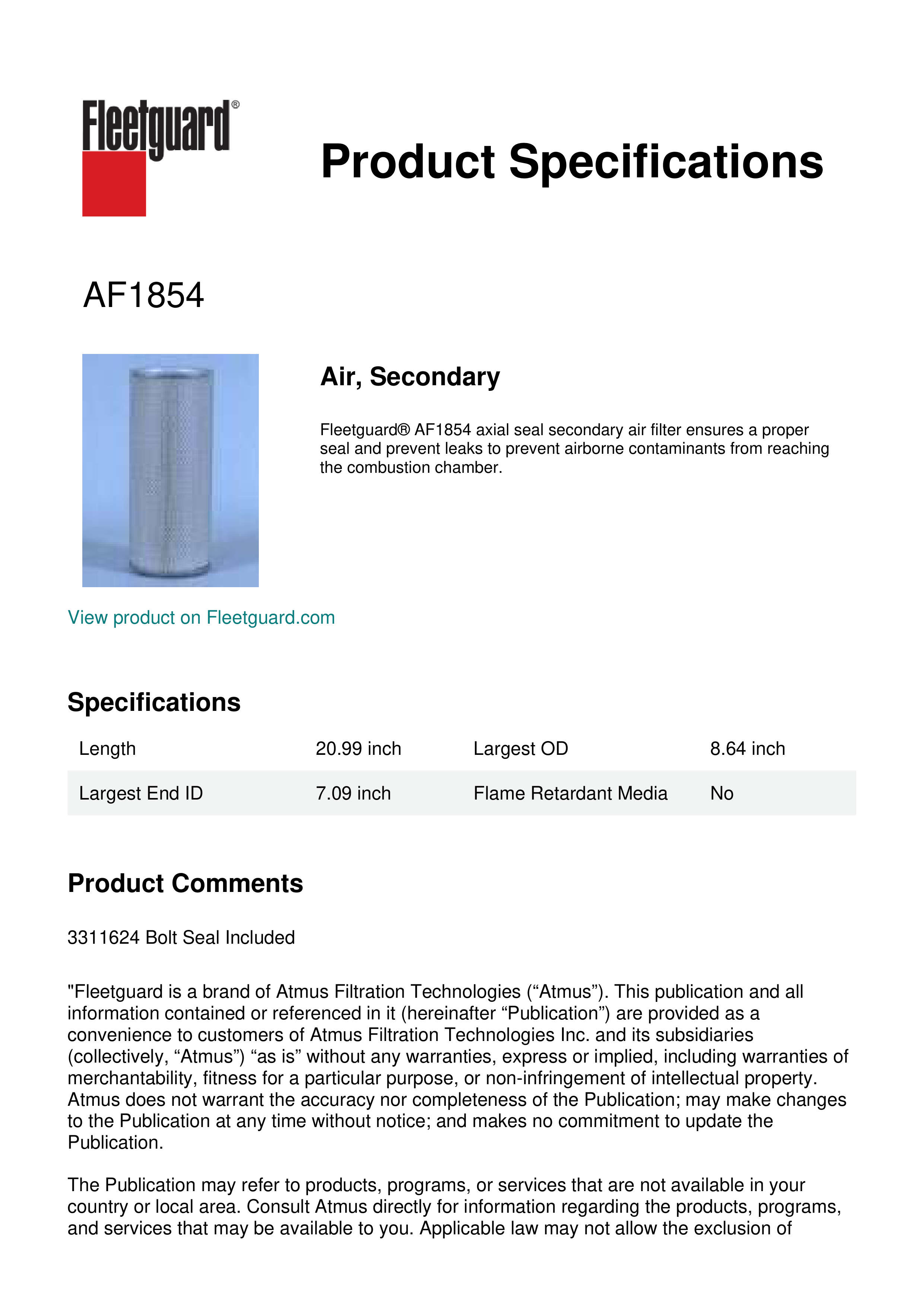 Fleetguard® AF1854 axial seal secondary air filter ensures a proper seal and prevent leaks to prevent airborne contaminants from reaching the combustion chamber.Specification