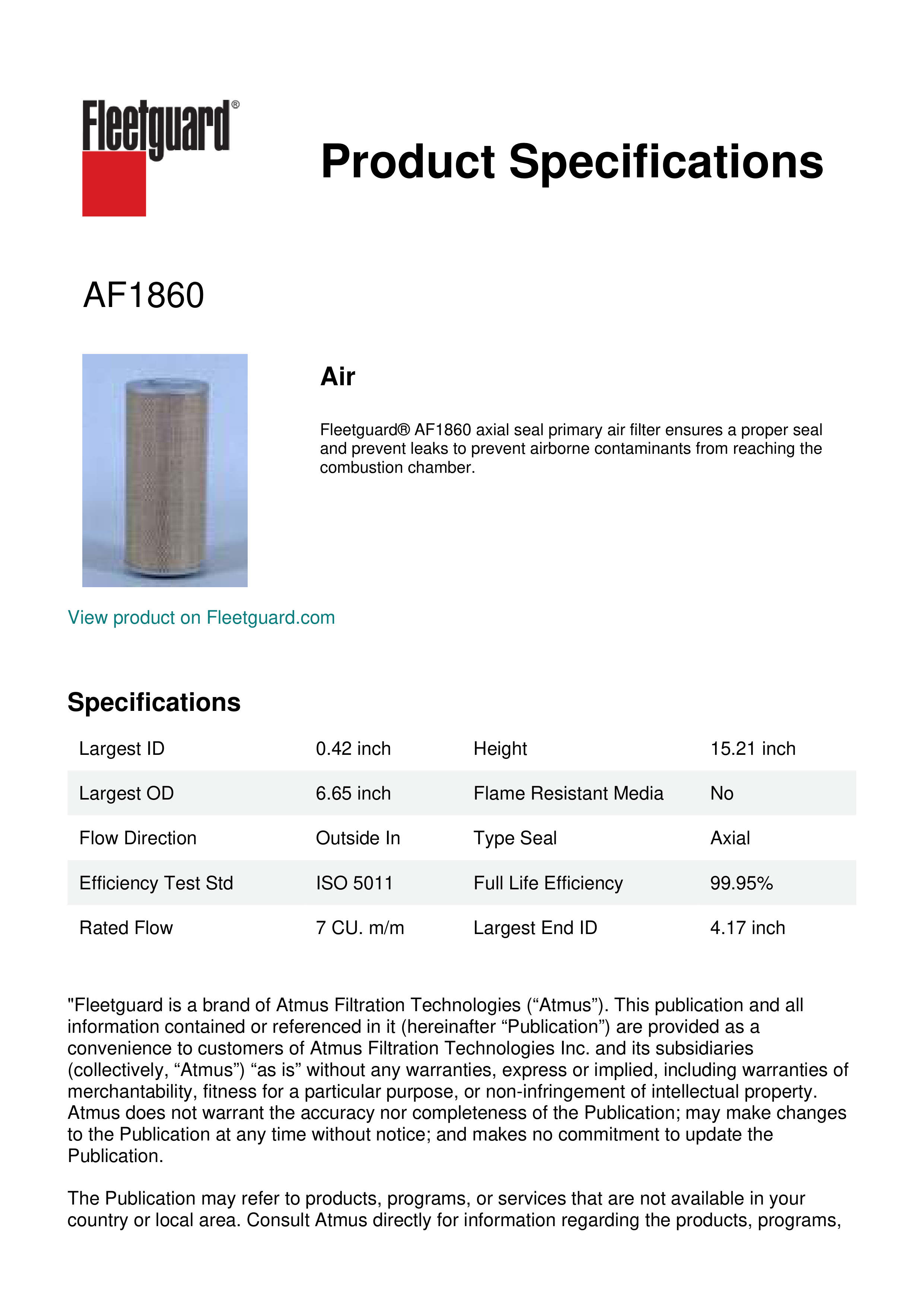 Fleetguard® AF1860 axial seal primary air filter ensures a proper seal and prevent leaks to prevent airborne contaminants from reaching the combustion chamber.Specification
