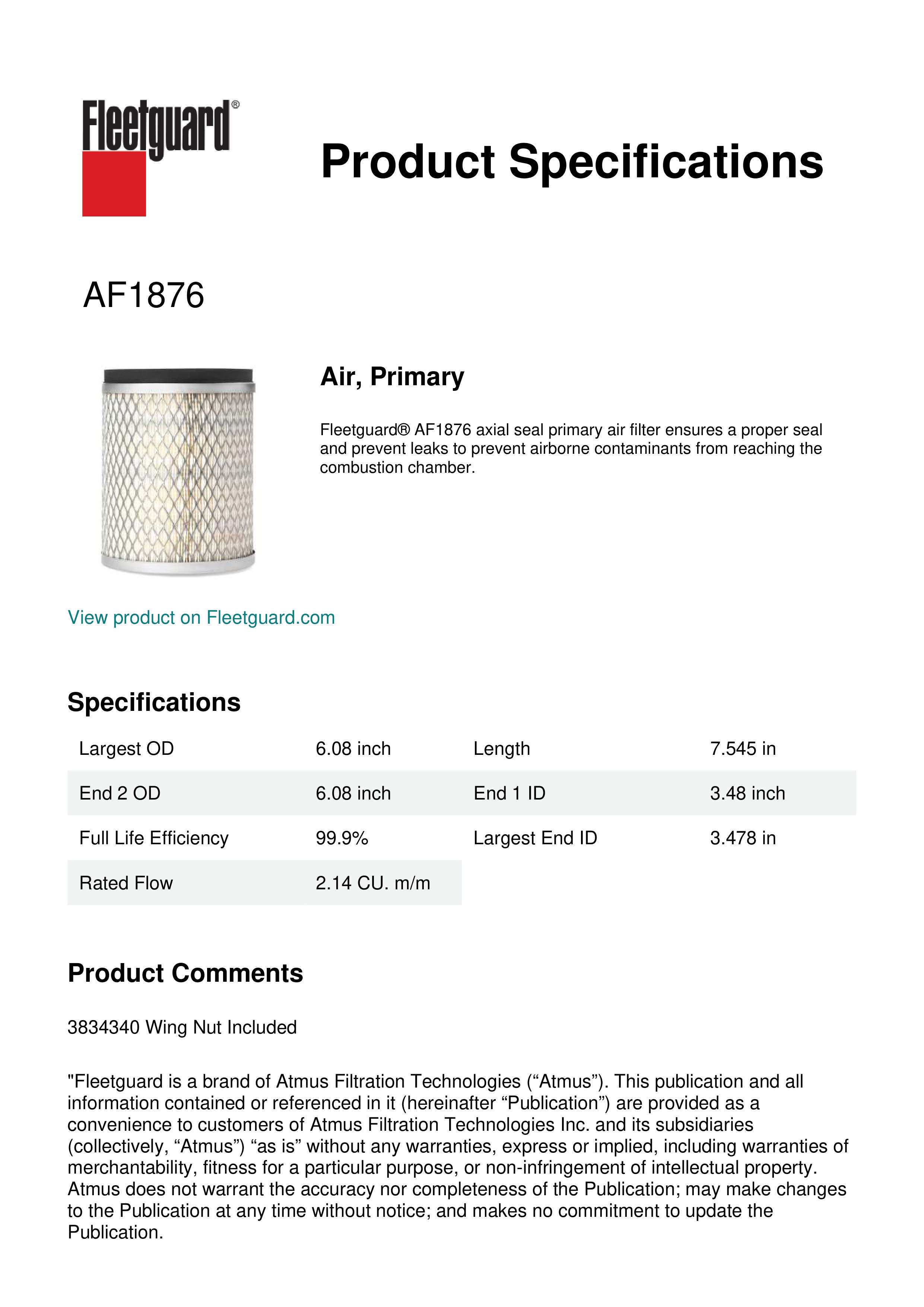 Fleetguard® AF1876 axial seal primary air filter ensures a proper seal and prevent leaks to prevent airborne contaminants from reaching the combustion chamber.