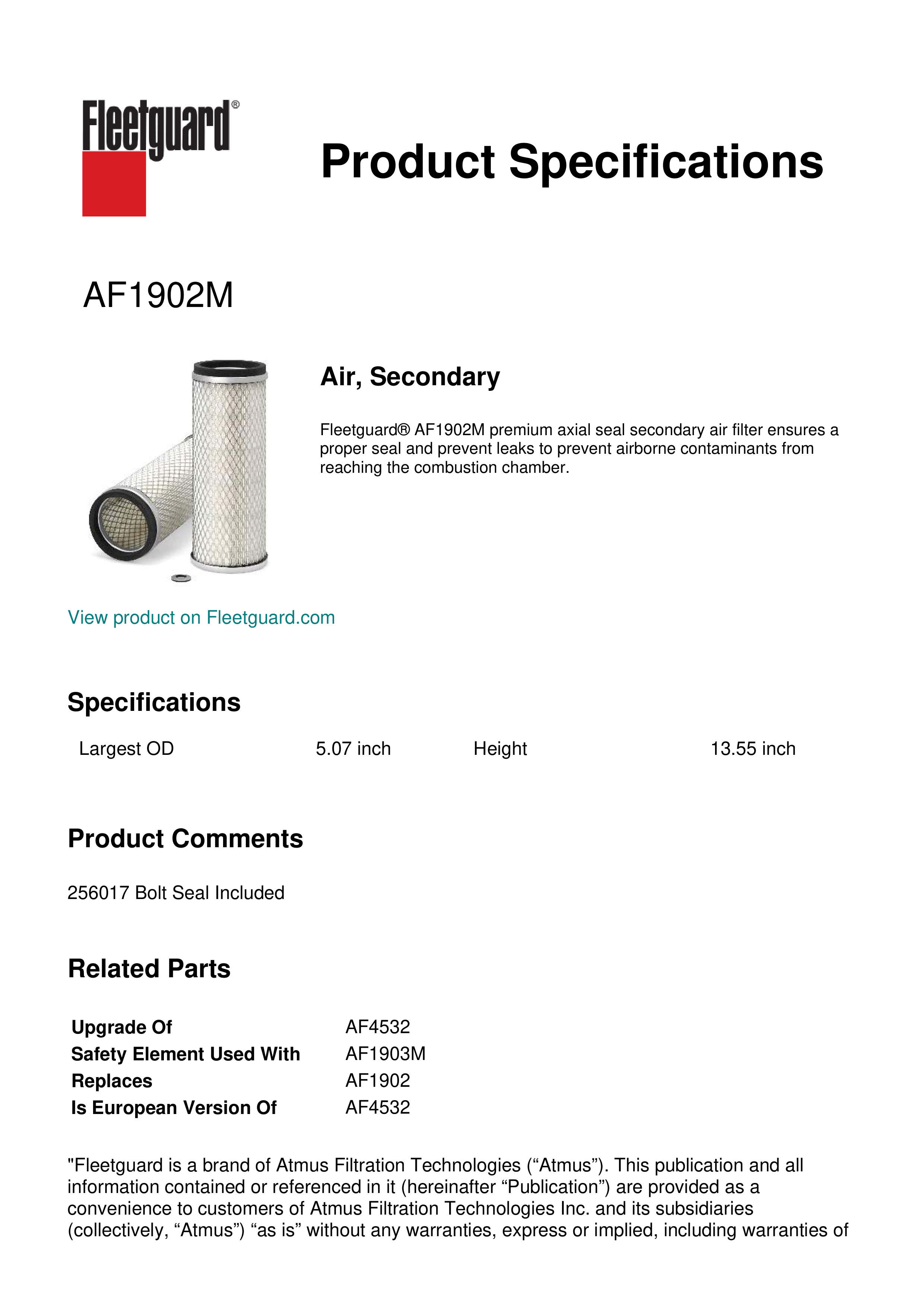 Fleetguard® AF1902M premium axial seal secondary air filter ensures a proper seal and prevent leaks to prevent airborne contaminants from reaching the combustion chamber.Specification