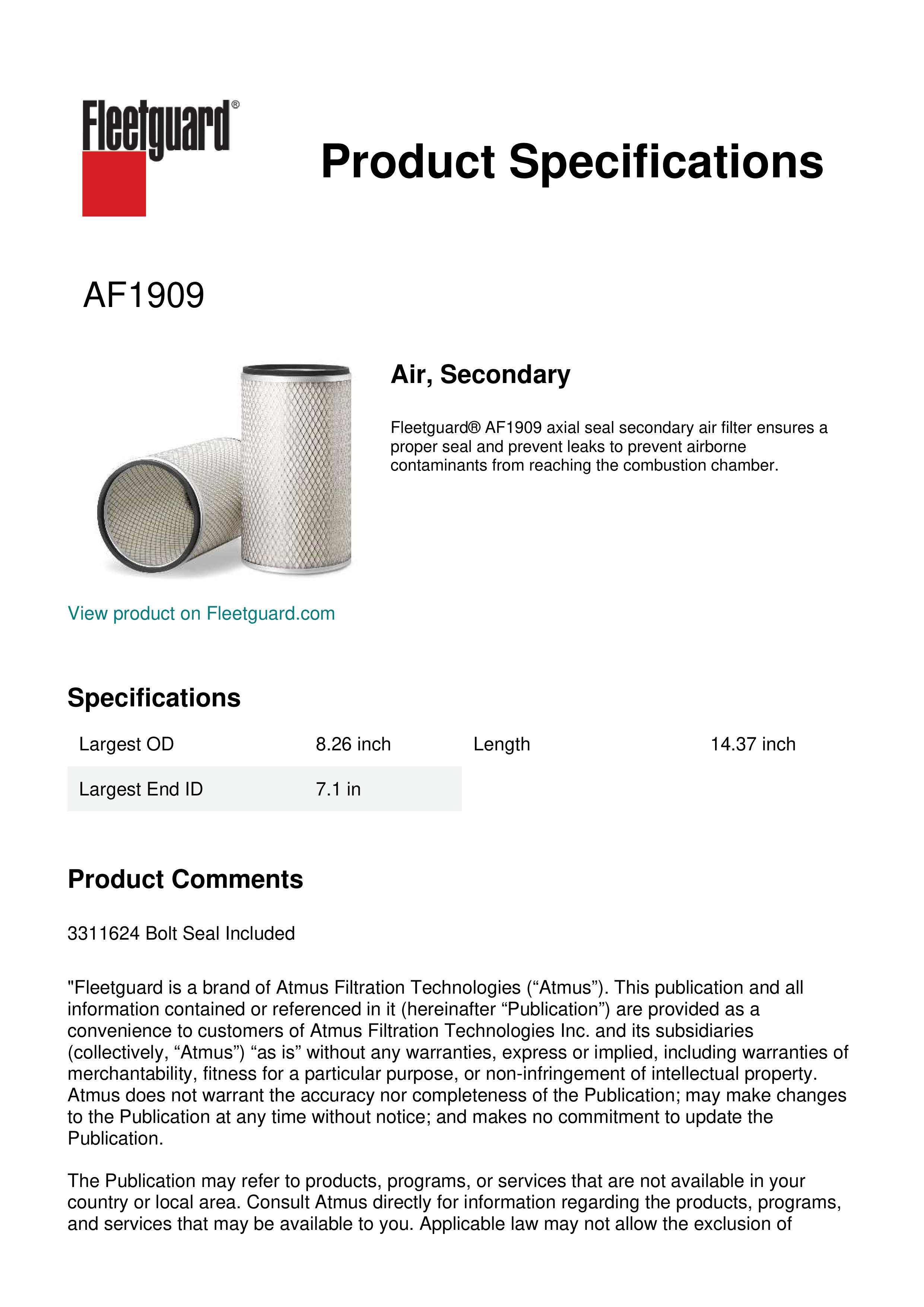 Fleetguard® AF1909 axial seal secondary air filter ensures a proper seal and prevent leaks to prevent airborne contaminants from reaching the combustion chamber.