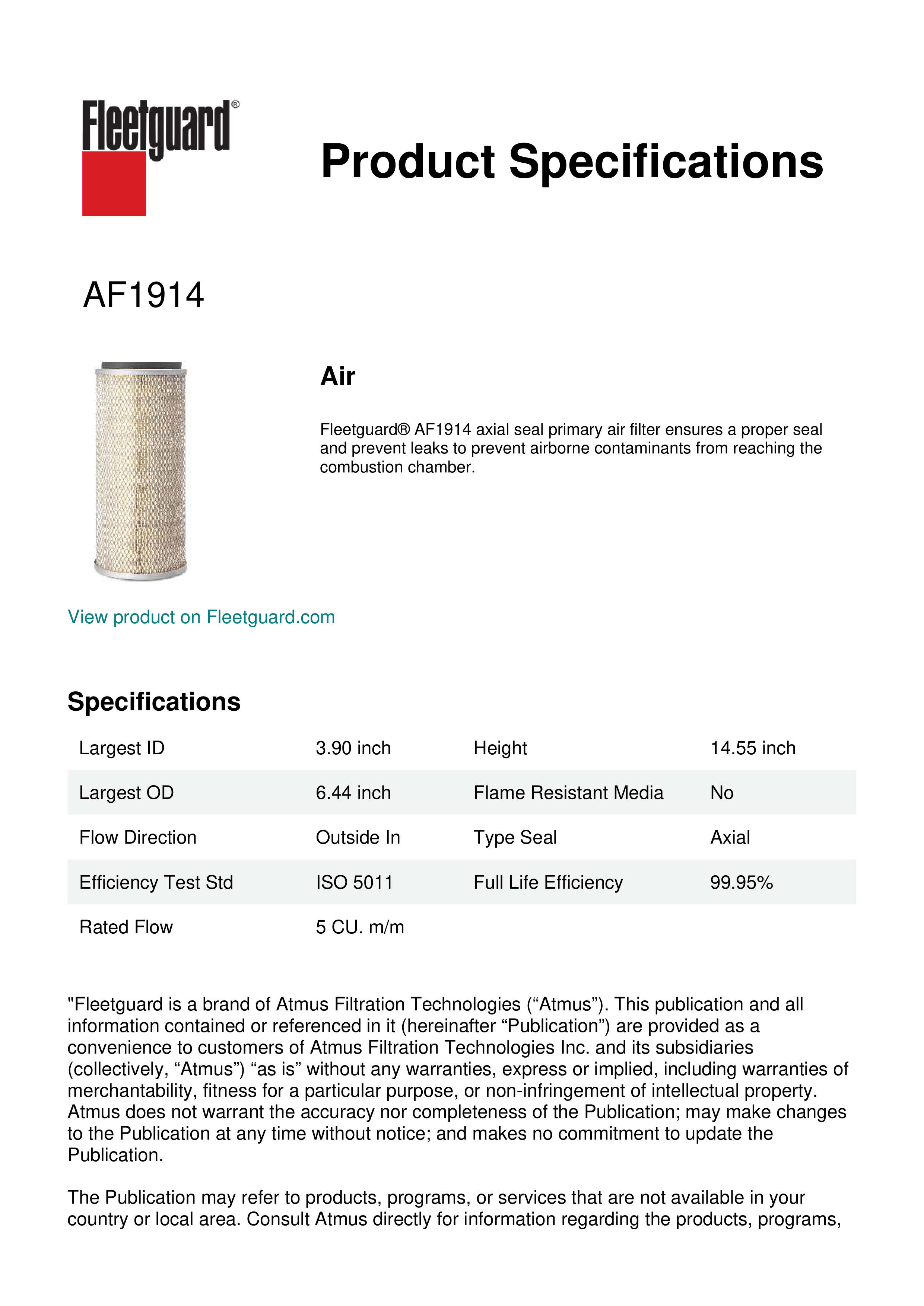 Fleetguard® AF1914 axial seal primary air filter ensures a proper seal and prevent leaks to prevent airborne contaminants from reaching the combustion chamber.