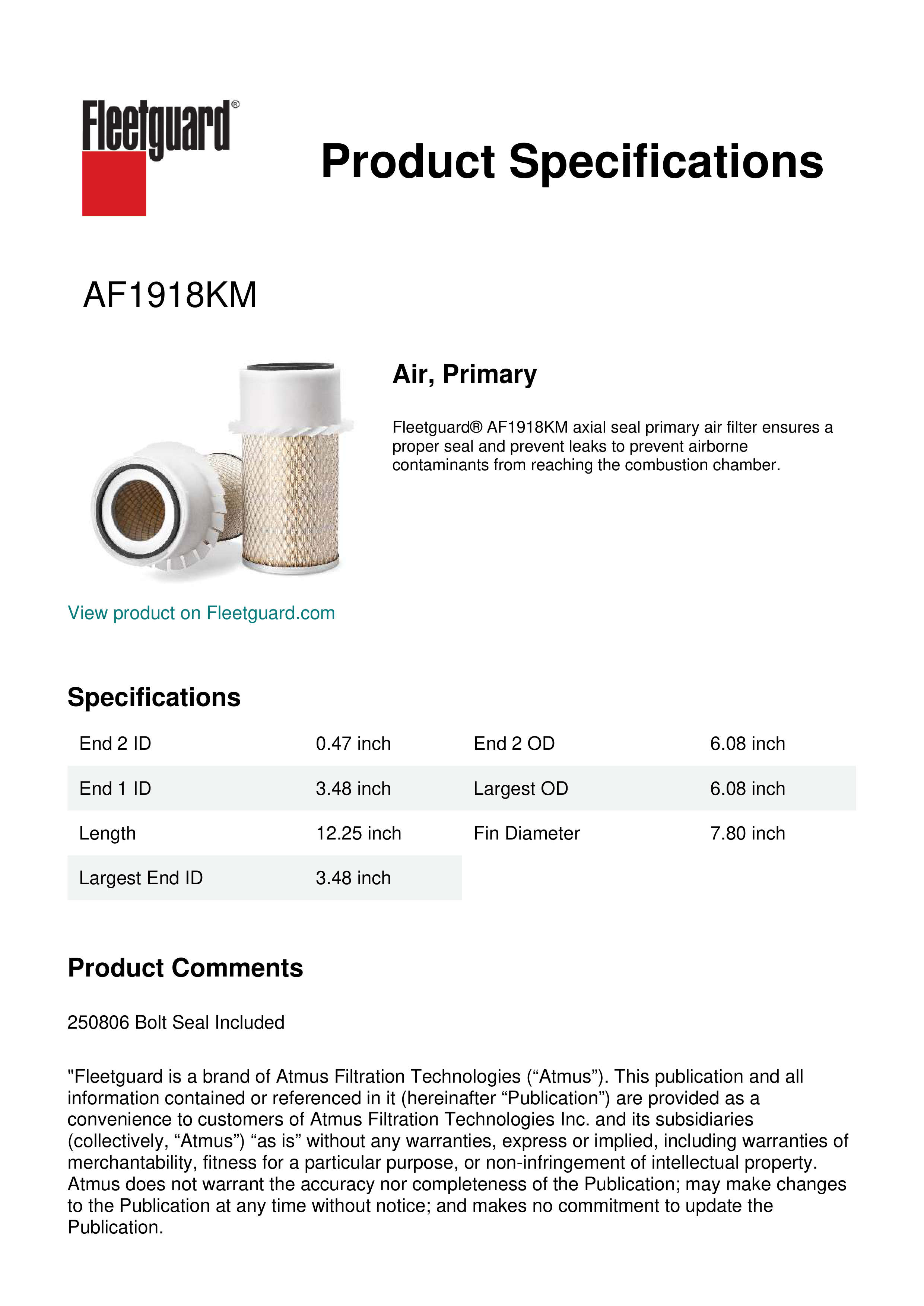 Fleetguard® AF1918KM axial seal primary air filter ensures a proper seal and prevent leaks to prevent airborne contaminants from reaching the combustion chamber.