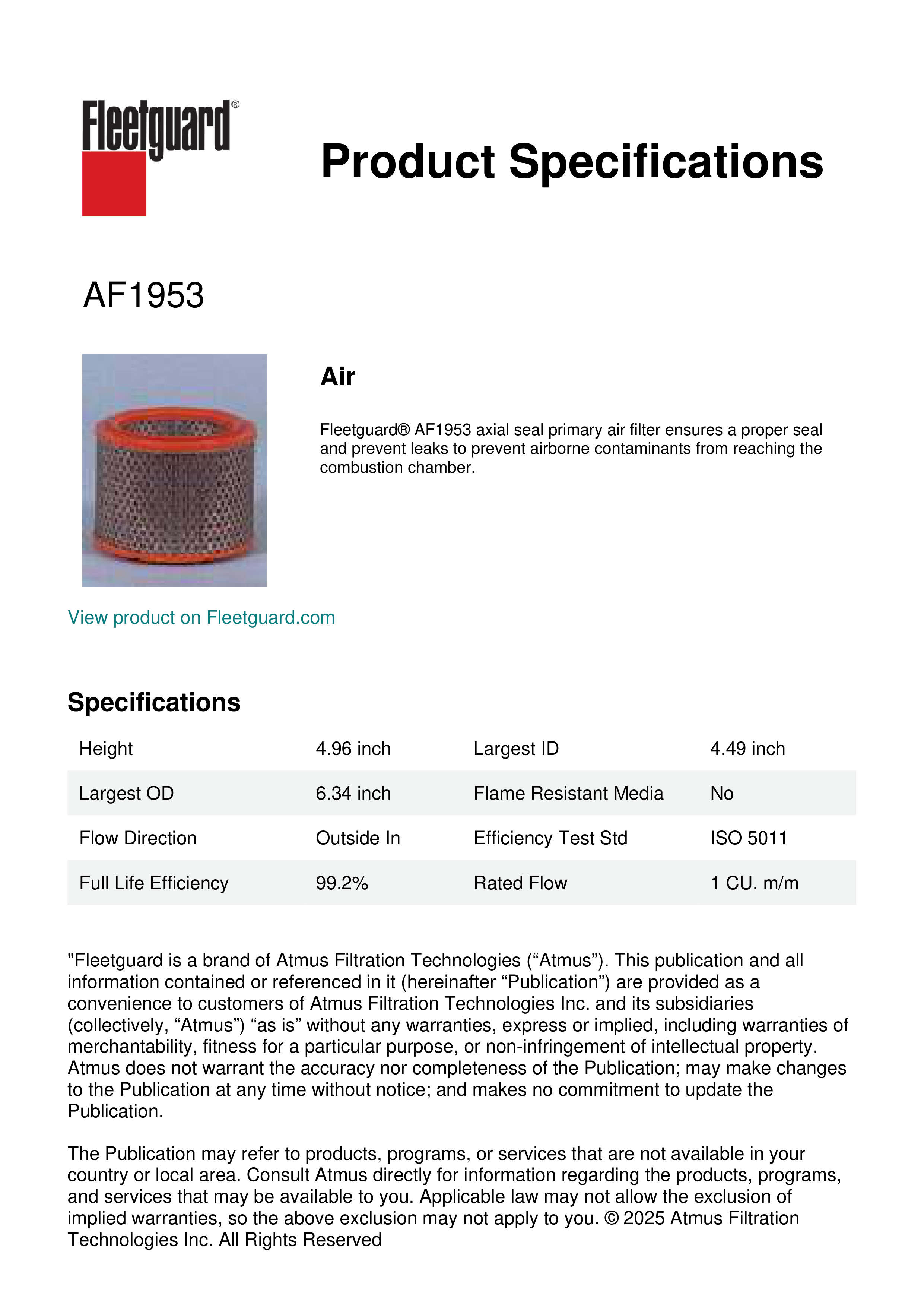 Fleetguard® AF1953 axial seal primary air filter ensures a proper seal and prevent leaks to prevent airborne contaminants from reaching the combustion chamber.