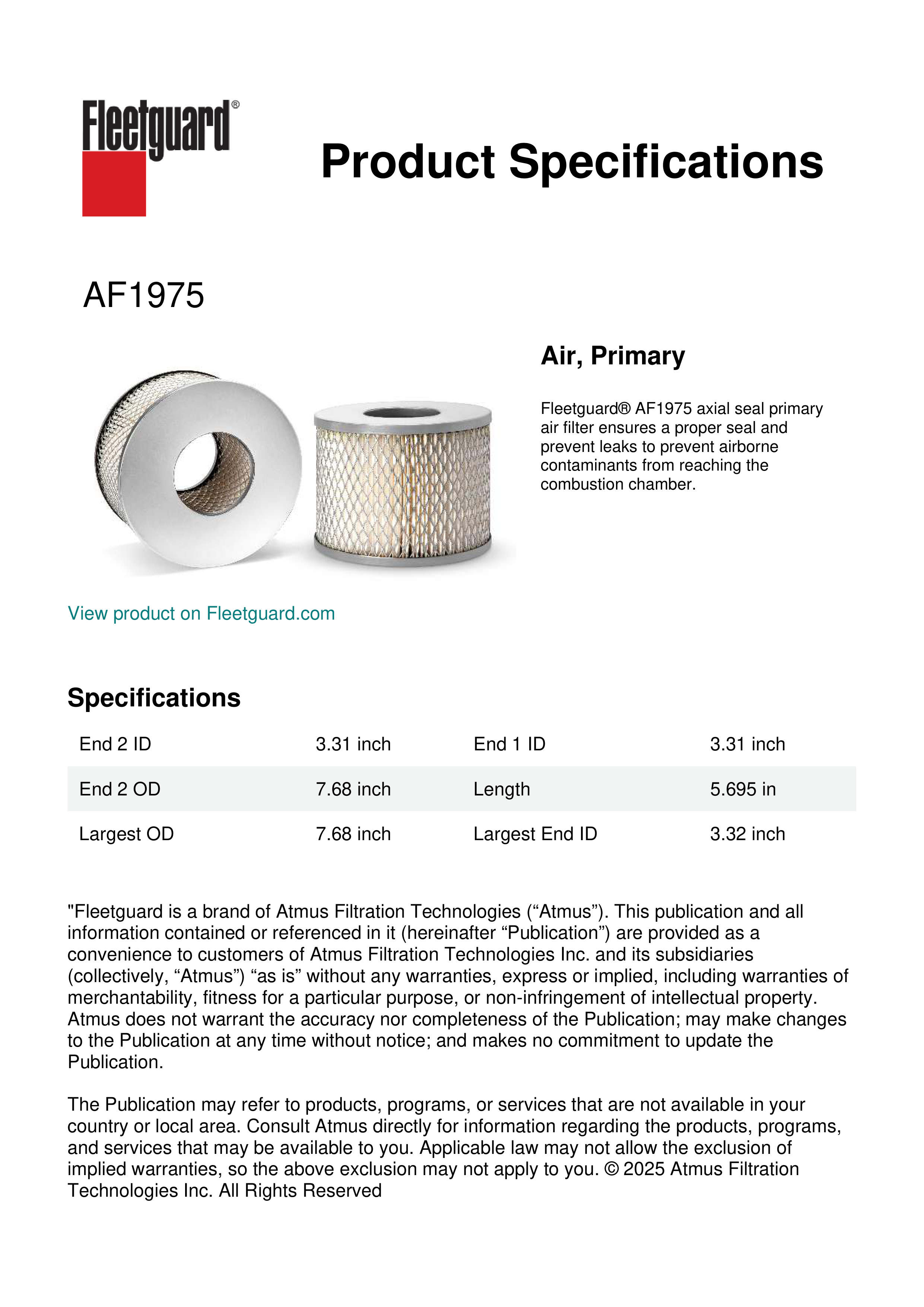 Fleetguard® AF1975 axial seal primary air filter ensures a proper seal and prevent leaks to prevent airborne contaminants from reaching the combustion chamber.