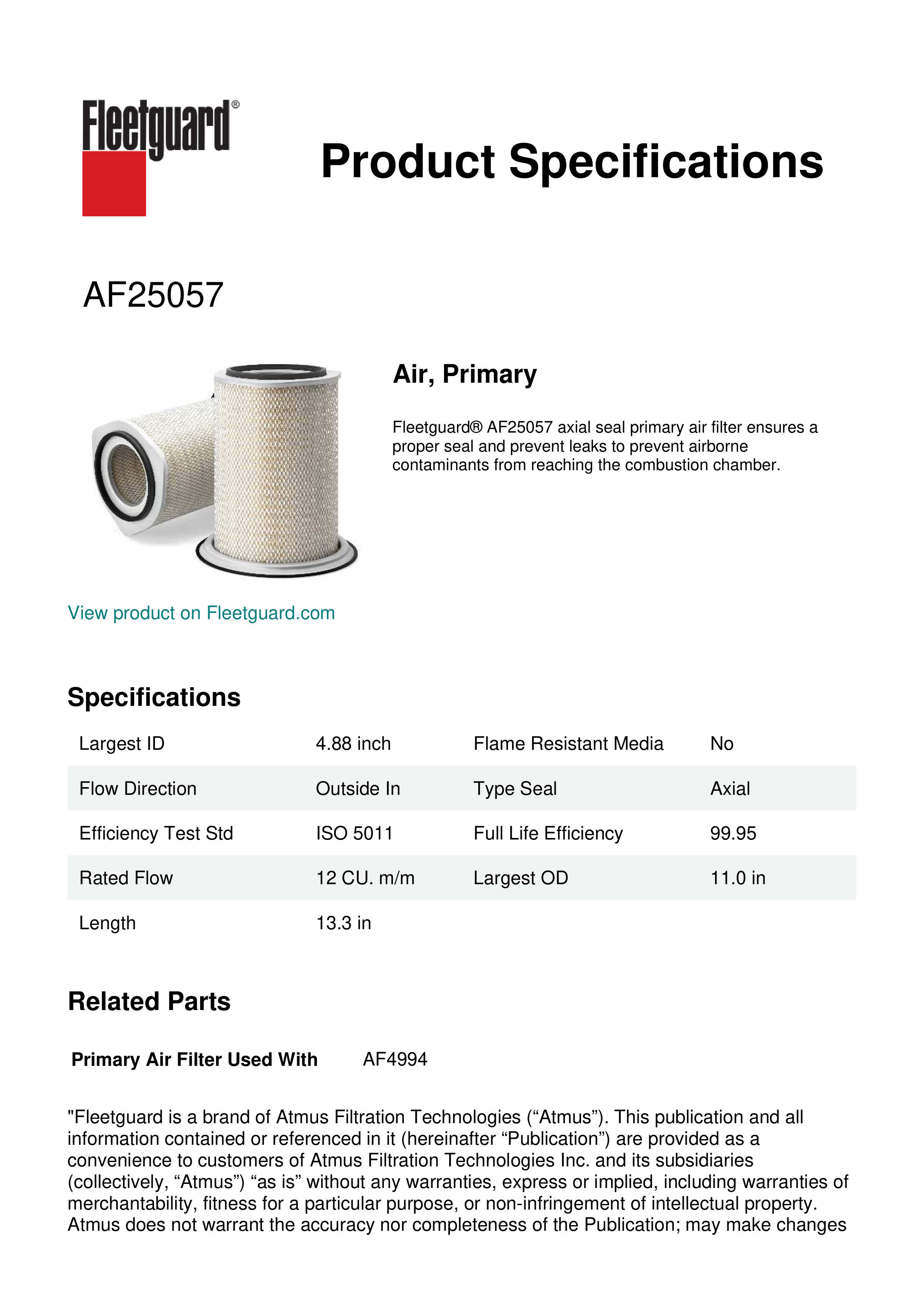 Fleetguard® AF25057 axial seal primary air filter ensures a proper seal and prevent leaks to prevent airborne contaminants from reaching the combustion chamber.