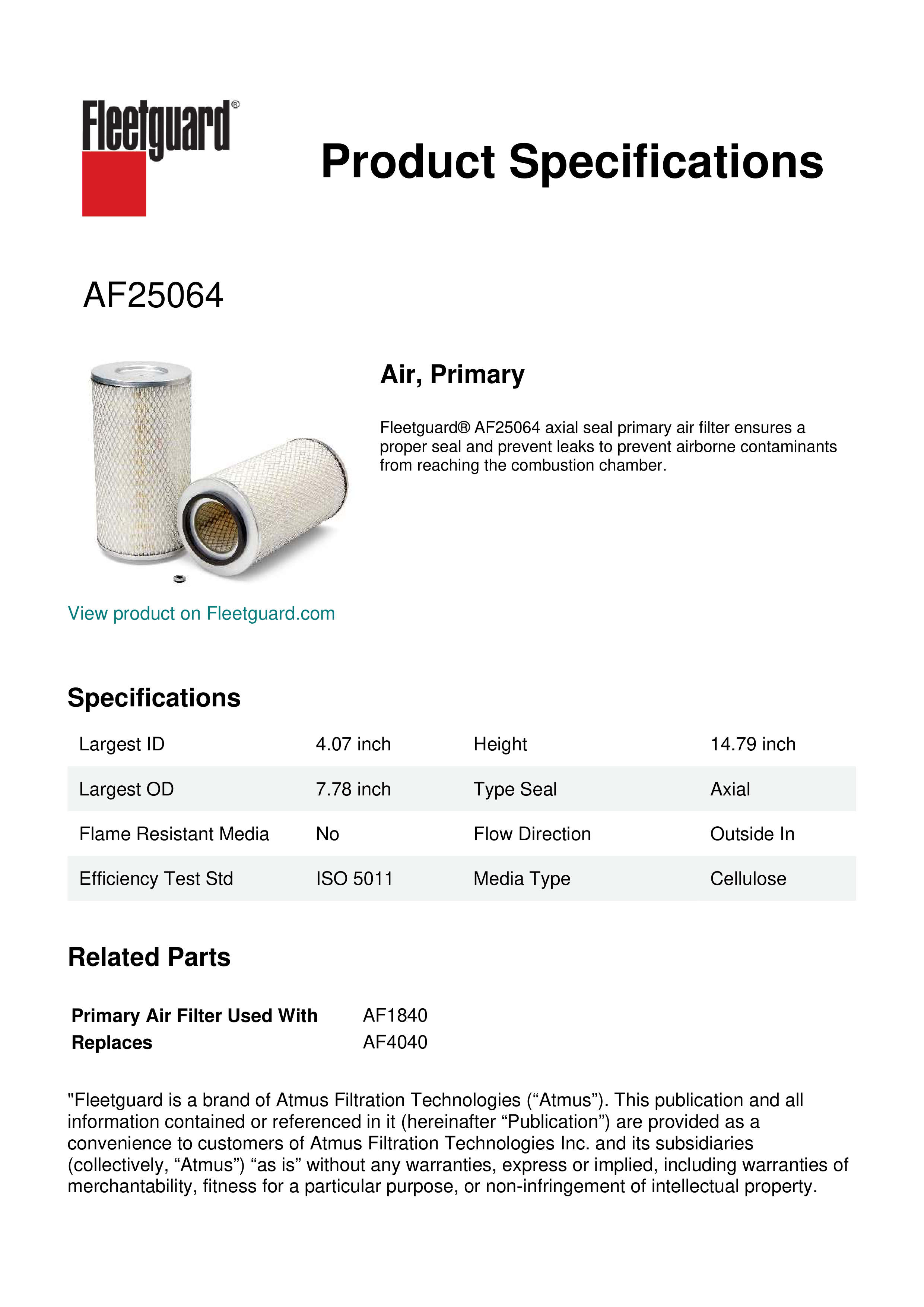 Fleetguard® AF25064 axial seal primary air filter ensures a proper seal and prevent leaks to prevent airborne contaminants from reaching the combustion chamber.Specification