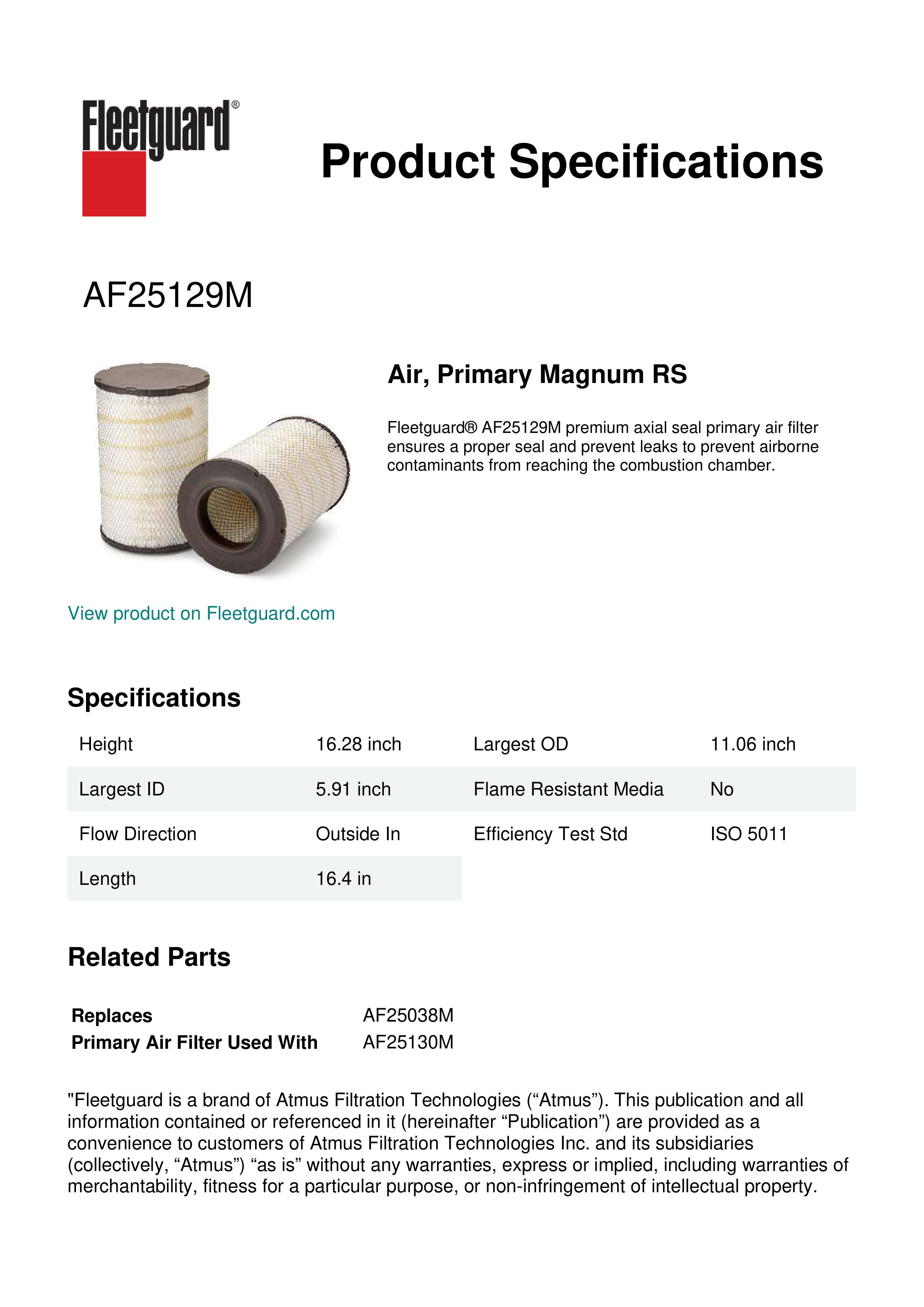 Fleetguard® AF25129M premium axial seal primary air filter ensures a proper seal and prevent leaks to prevent airborne contaminants from reaching the combustion chamber.