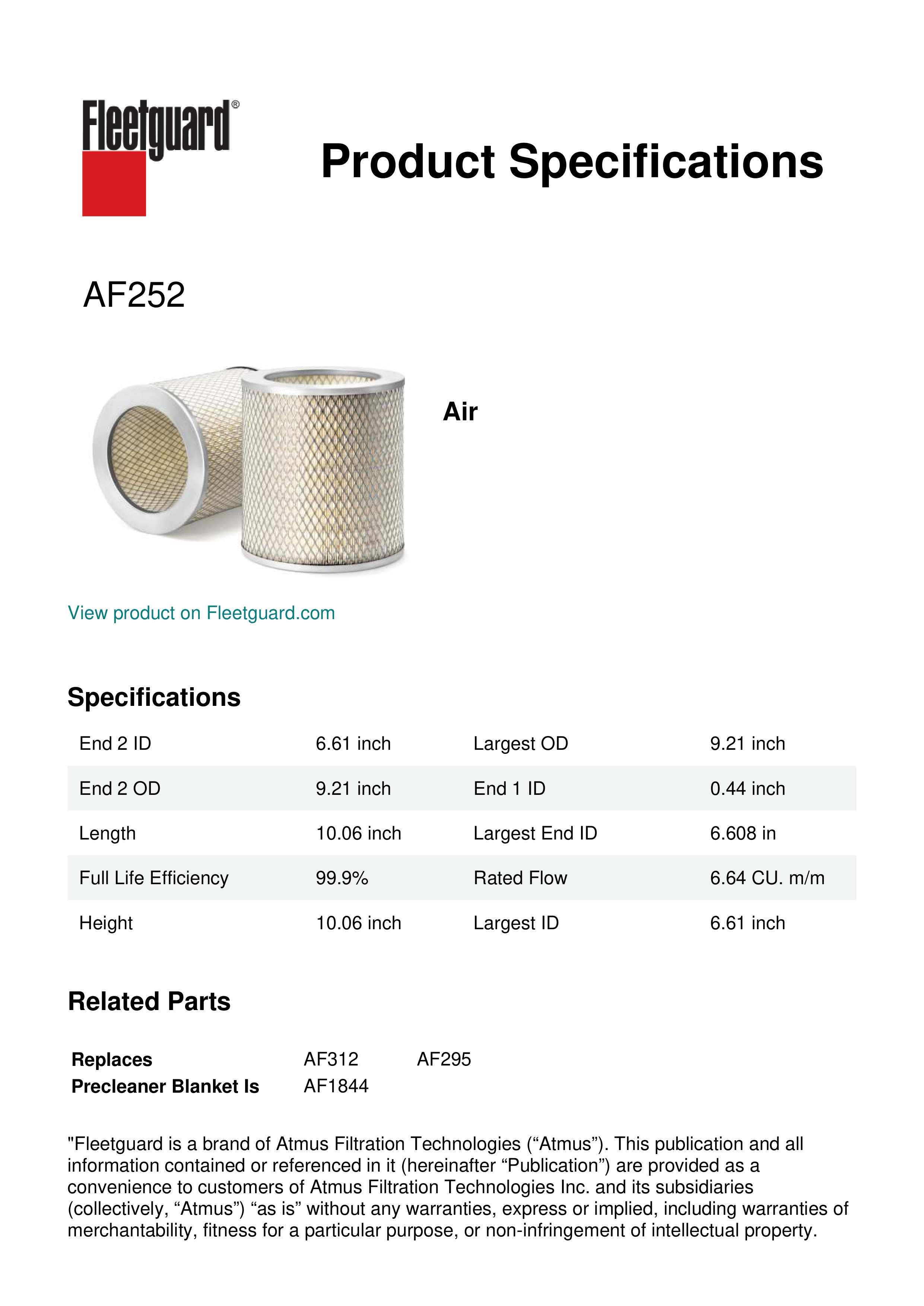 Fleetguard® AF252 spin-on lube filter meets or exceeds OE performance requirements and the new challenges of modern engine technology.Specification