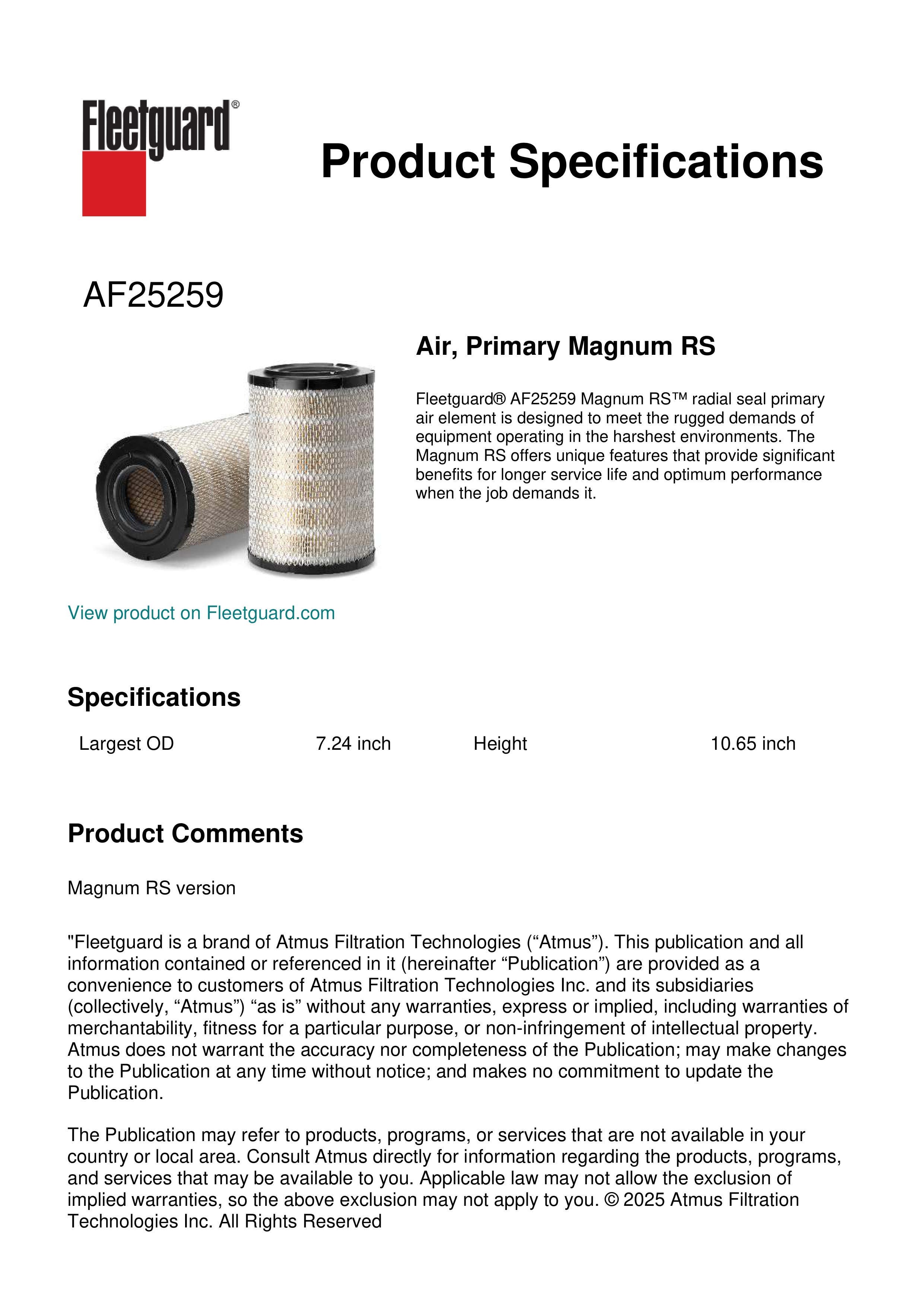 Fleetguard® AF25259 Magnum RS™ radial seal primary air element is designed to meet the rugged demands of equipment operating in the harshest environments. The Magnum RS offers unique features that provide significant benefits for longer service life and optimum performance when the job demands it.Specification