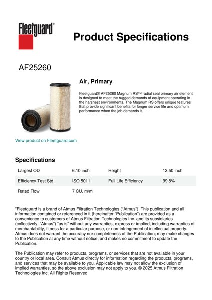 Fleetguard® AF25260 Magnum RS™ radial seal primary air element is designed to meet the rugged demands of equipment operating in the harshest environments. The Magnum RS offers unique features that provide significant benefits for longer service life and optimum performance when the job demands it.Specification