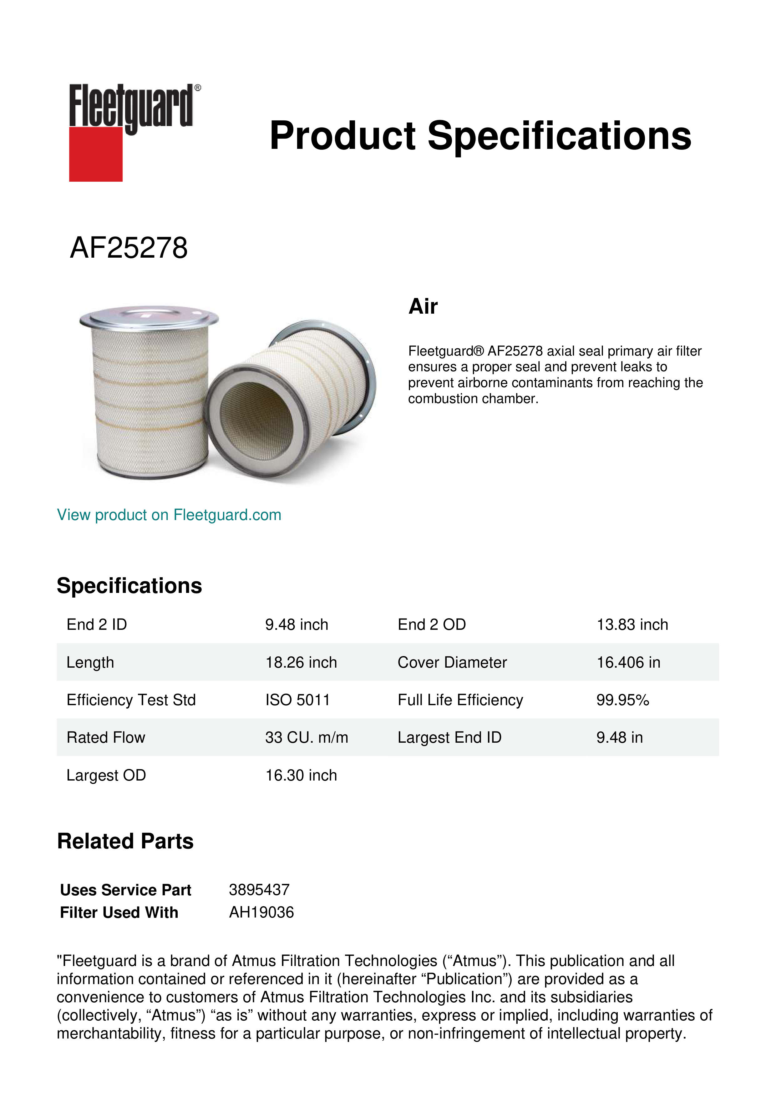Fleetguard® AF25278 axial seal primary air filter ensures a proper seal and prevent leaks to prevent airborne contaminants from reaching the combustion chamber.