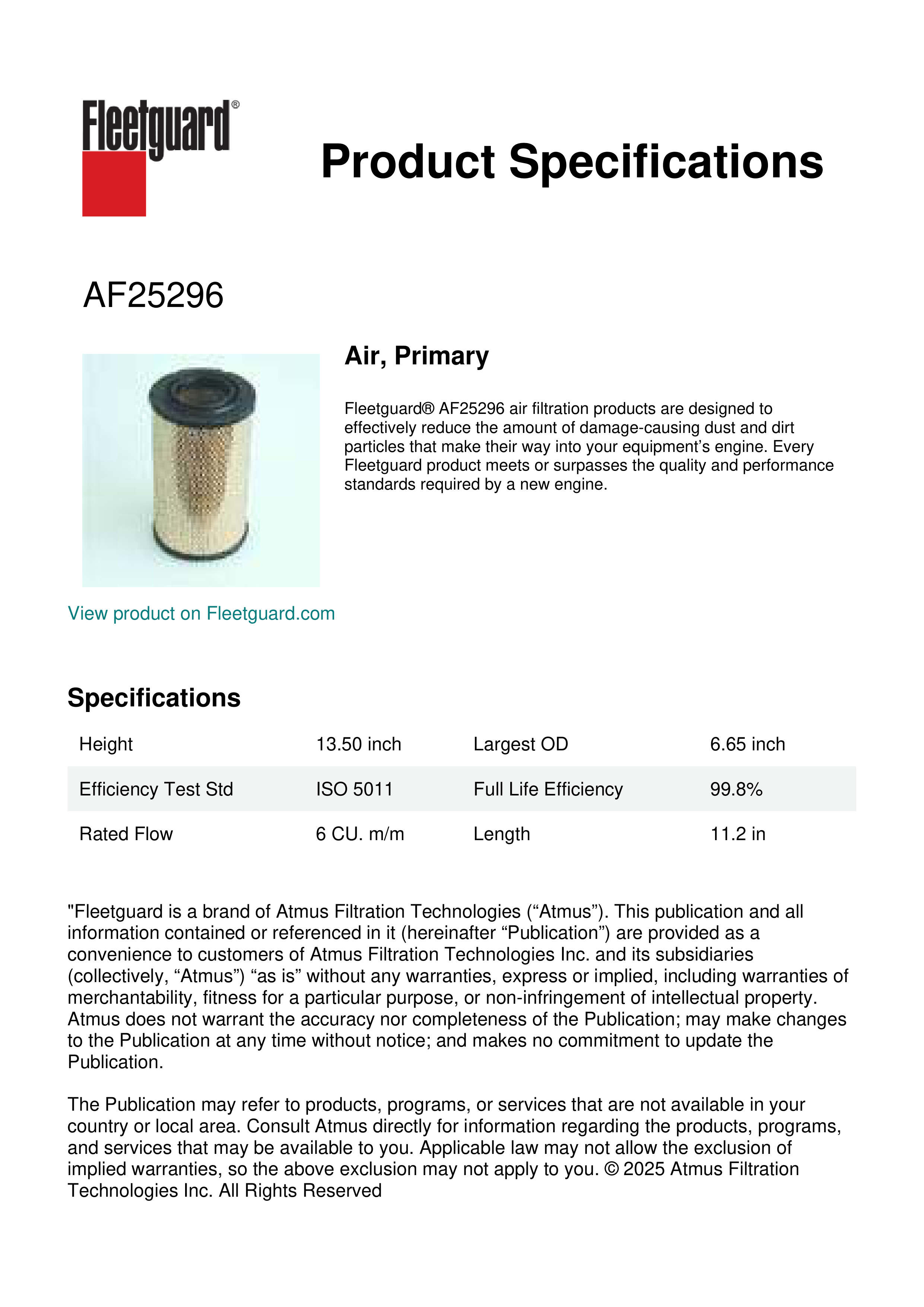 Fleetguard® AF25296 air filtration products are designed to effectively reduce the amount of damage-causing dust and dirt particles that make their way into your equipment’s engine. Every Fleetguard product meets or surpasses the quality and performance standards required by a new engine.Specification