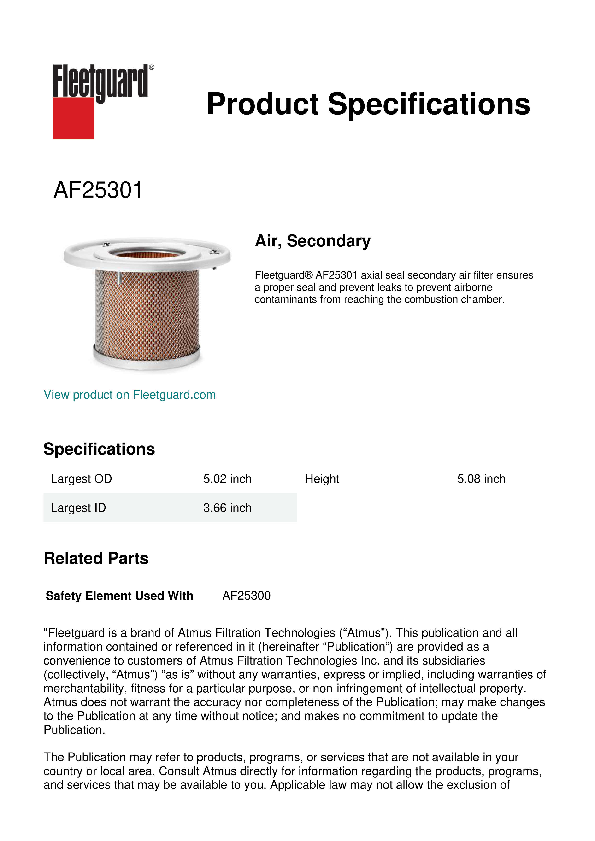 Fleetguard® AF25301 axial seal secondary air filter ensures a proper seal and prevent leaks to prevent airborne contaminants from reaching the combustion chamber.Specification