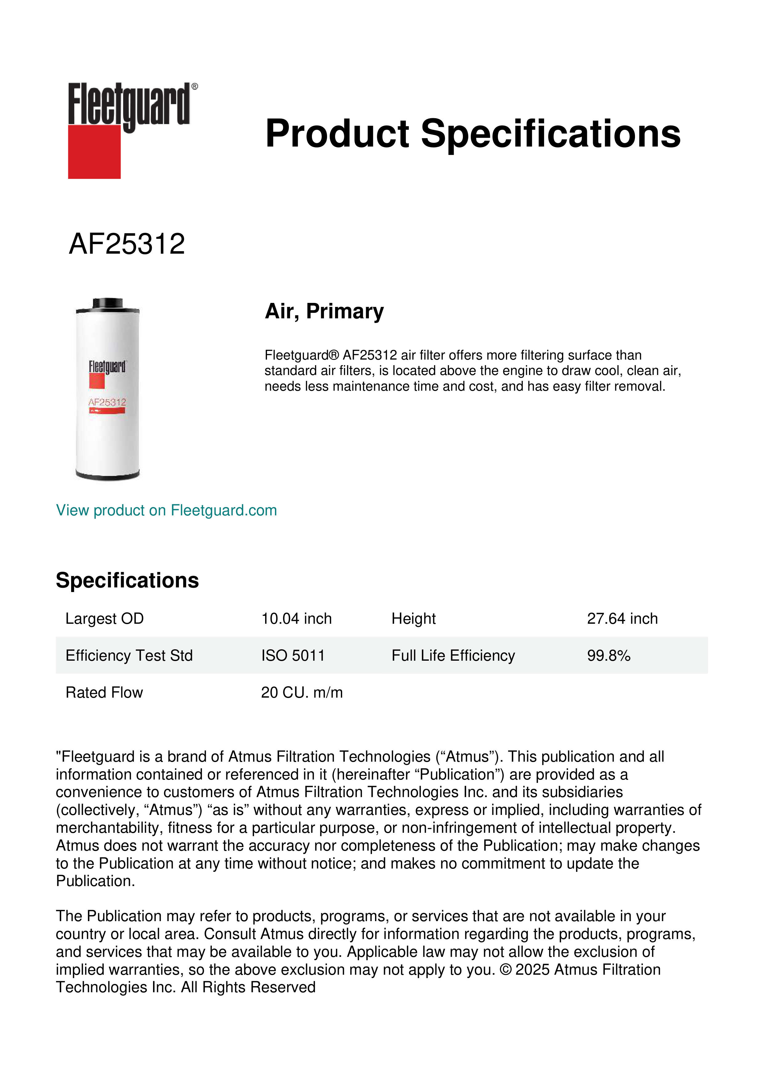 Fleetguard® AF25312 air filter offers more filtering surface than standard air filters, is located above the engine to draw cool, clean air, needs less maintenance time and cost, and has easy filter removal.Specification