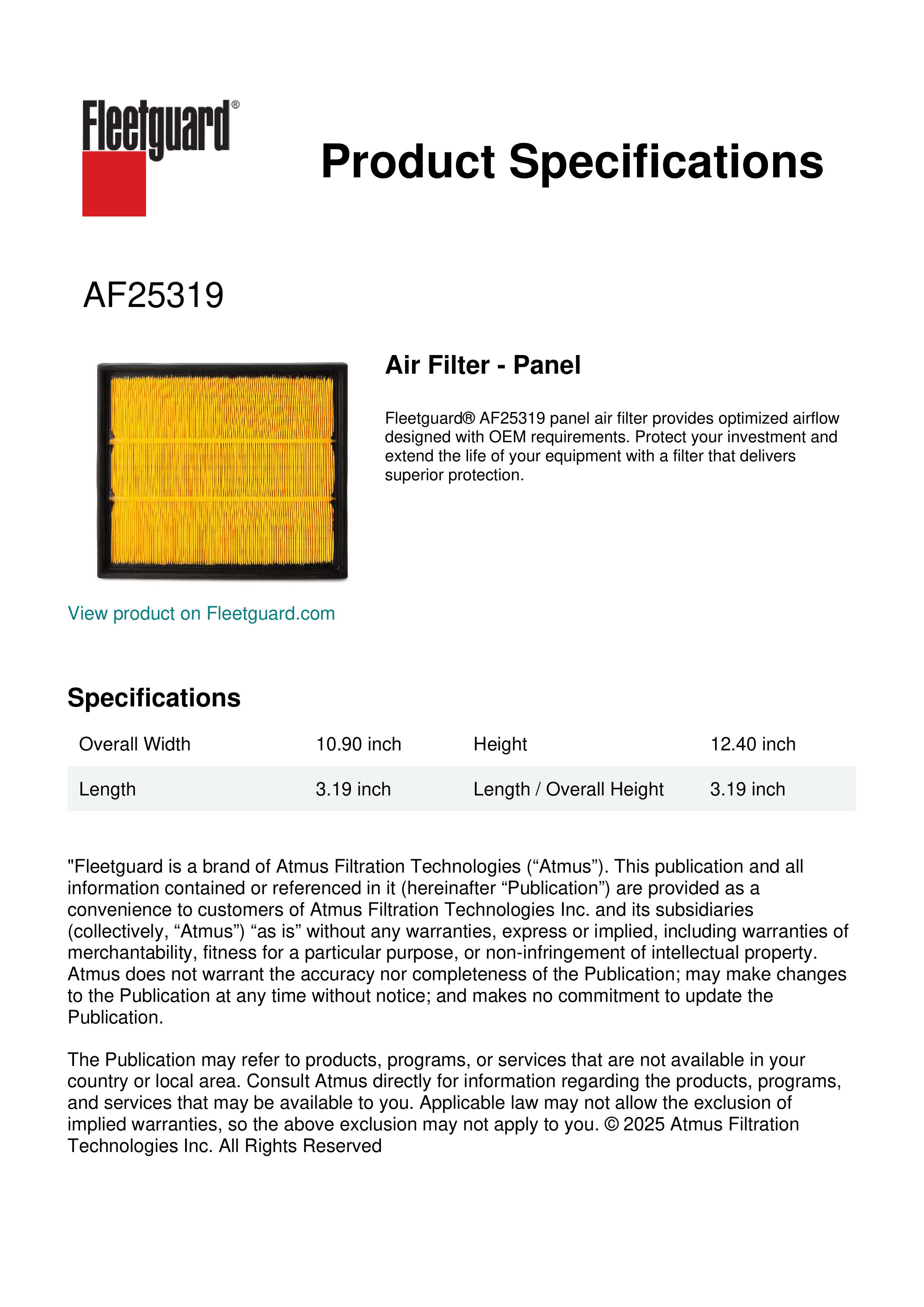 Fleetguard® AF25319 panel air filter provides optimized airflow designed with OEM requirements. Protect your investment and extend the life of your equipment with a filter that delivers superior protection.Specification