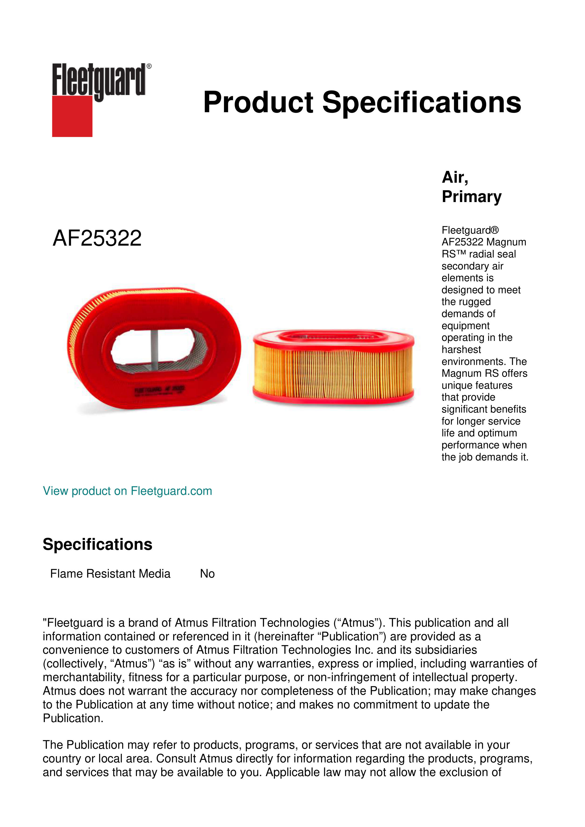 Fleetguard® AF25322 Magnum RS™ radial seal secondary air elements is designed to meet the rugged demands of equipment operating in the harshest environments. The Magnum RS offers unique features that provide significant benefits for longer service life and optimum performance when the job demands it.Specification