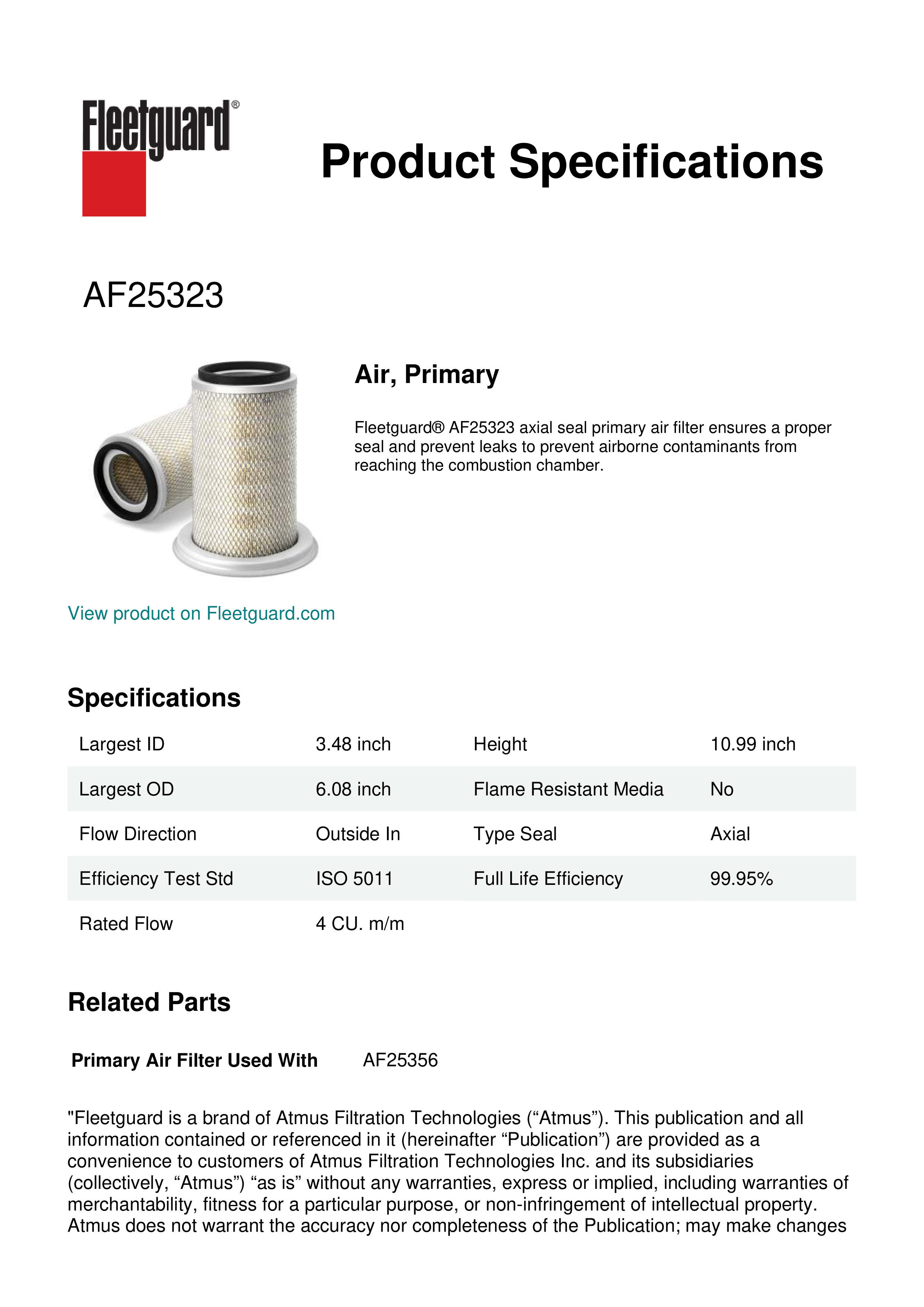 Fleetguard® AF25323 axial seal primary air filter ensures a proper seal and prevent leaks to prevent airborne contaminants from reaching the combustion chamber.