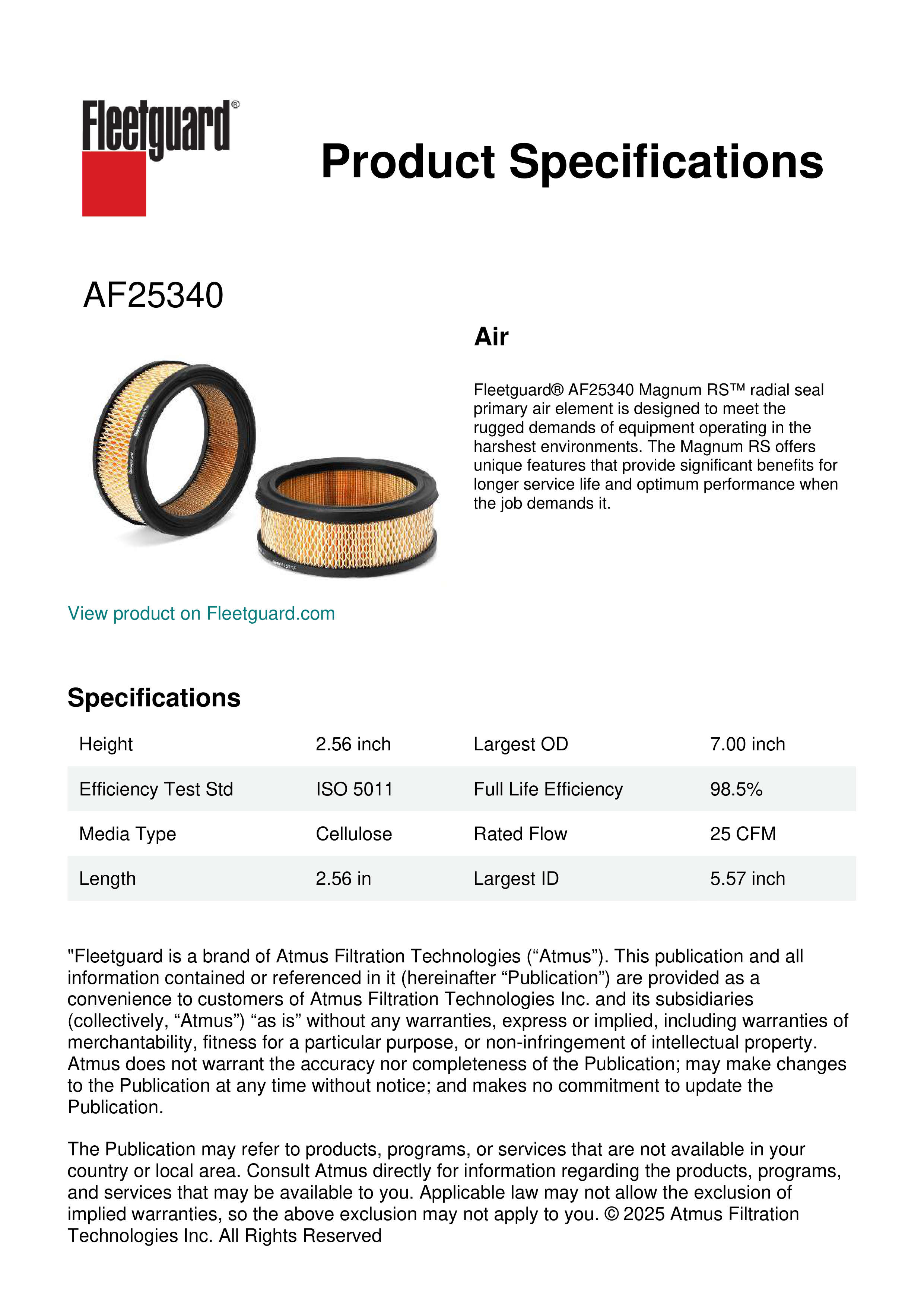 Fleetguard® AF25340 Magnum RS™ radial seal primary air element is designed to meet the rugged demands of equipment operating in the harshest environments. The Magnum RS offers unique features that provide significant benefits for longer service life and optimum performance when the job demands it.Specification