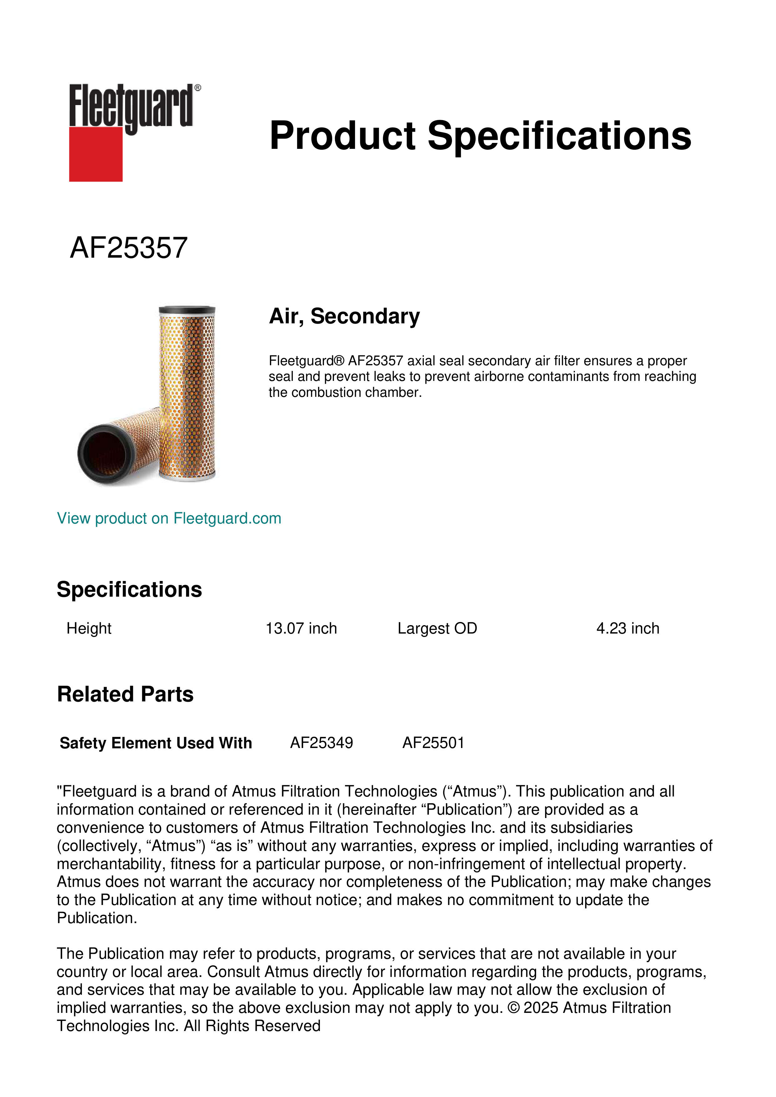 Fleetguard® AF25357 axial seal secondary air filter ensures a proper seal and prevent leaks to prevent airborne contaminants from reaching the combustion chamber.
