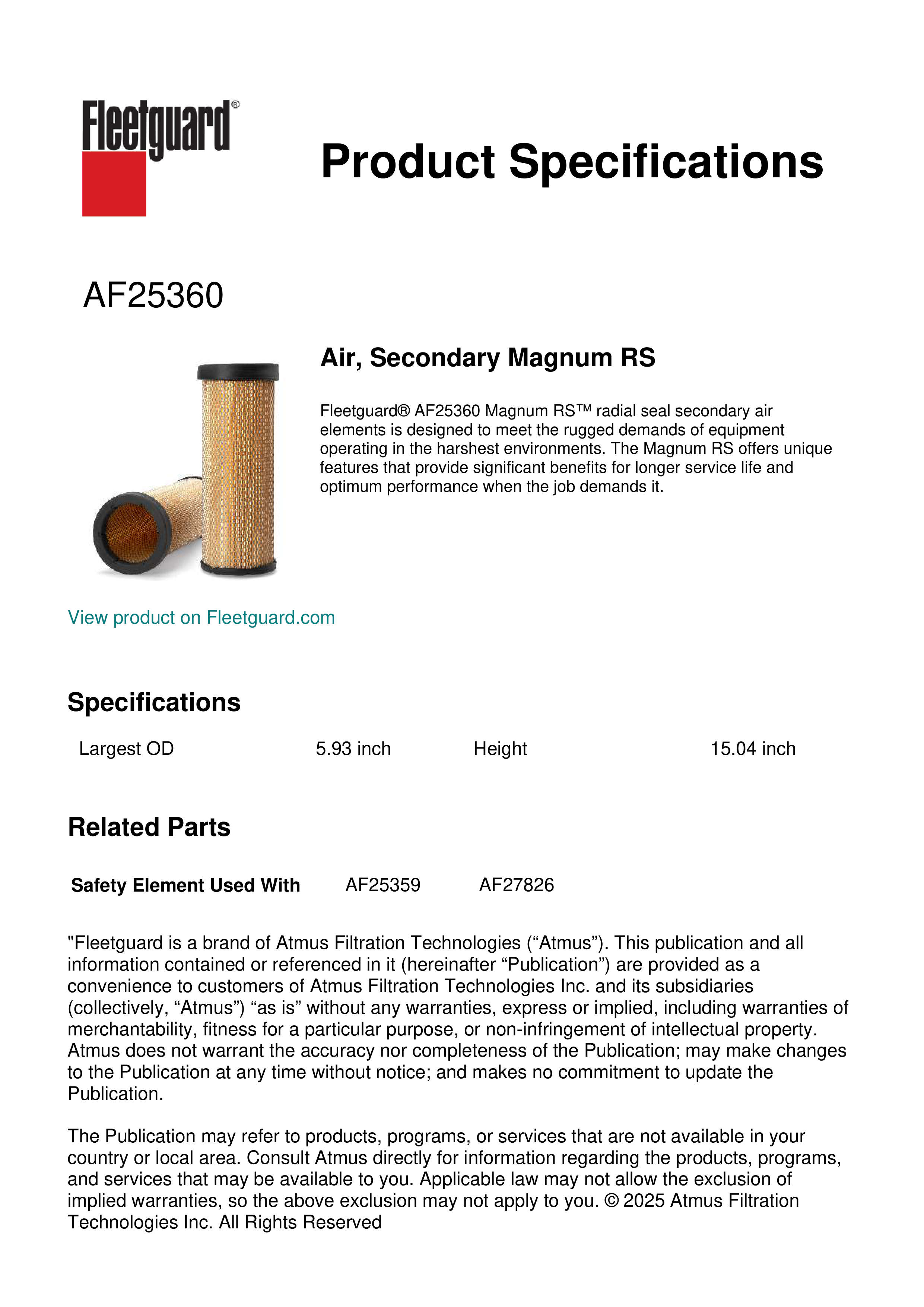 Fleetguard® AF25360 Magnum RS™ radial seal secondary air elements is designed to meet the rugged demands of equipment operating in the harshest environments. The Magnum RS offers unique features that provide significant benefits for longer service life and optimum performance when the job demands it.Specification