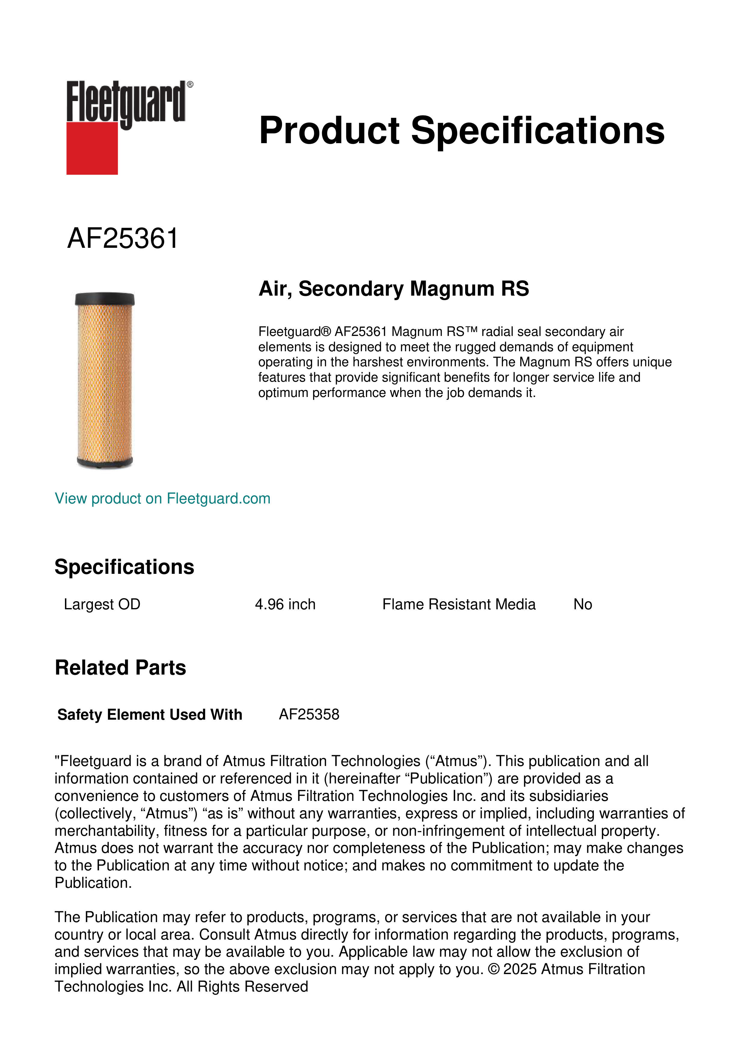 Fleetguard® AF25361 Magnum RS™ radial seal secondary air elements is designed to meet the rugged demands of equipment operating in the harshest environments. The Magnum RS offers unique features that provide significant benefits for longer service life and optimum performance when the job demands it.Specification