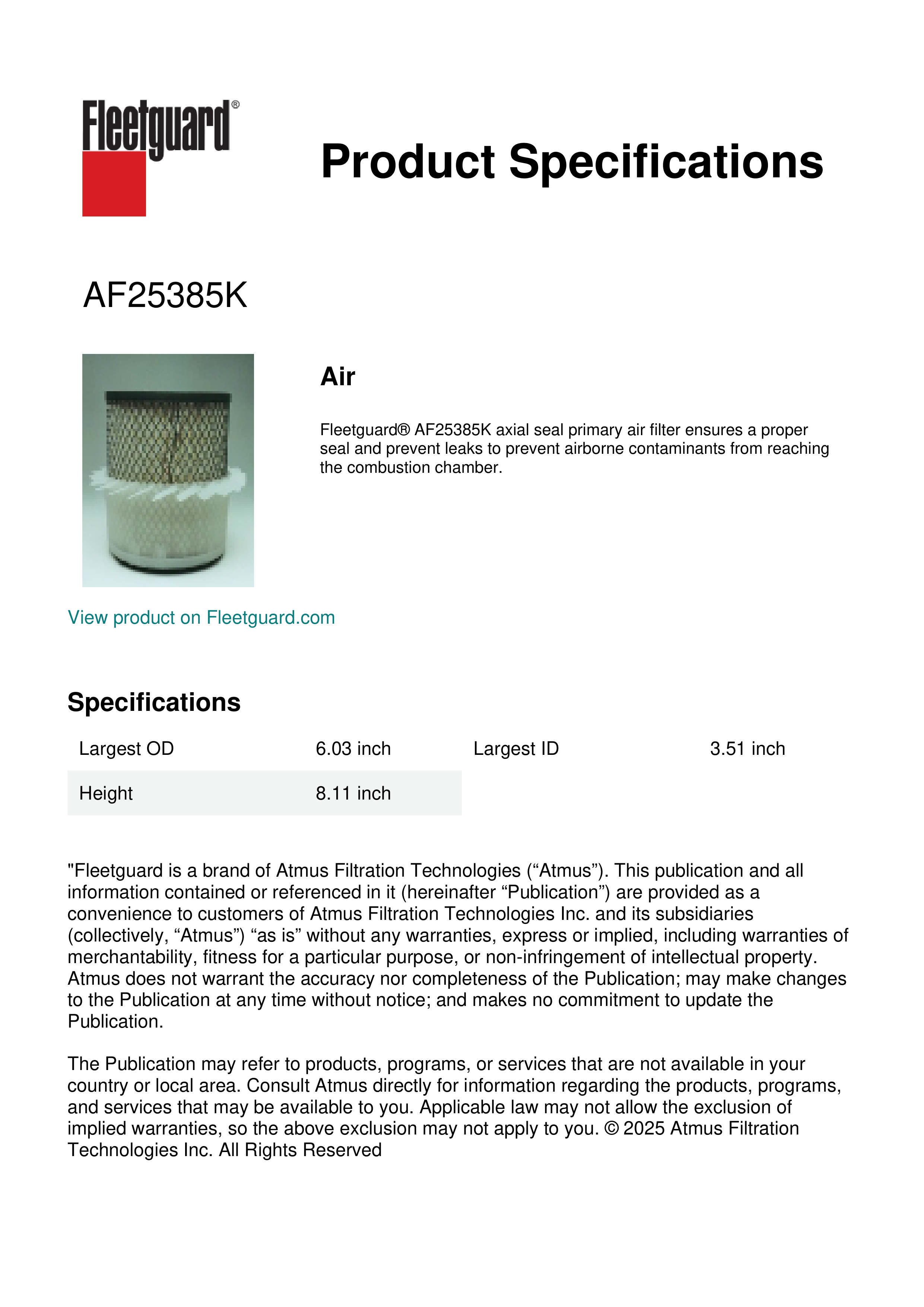 Fleetguard® AF25385K axial seal primary air filter ensures a proper seal and prevent leaks to prevent airborne contaminants from reaching the combustion chamber.