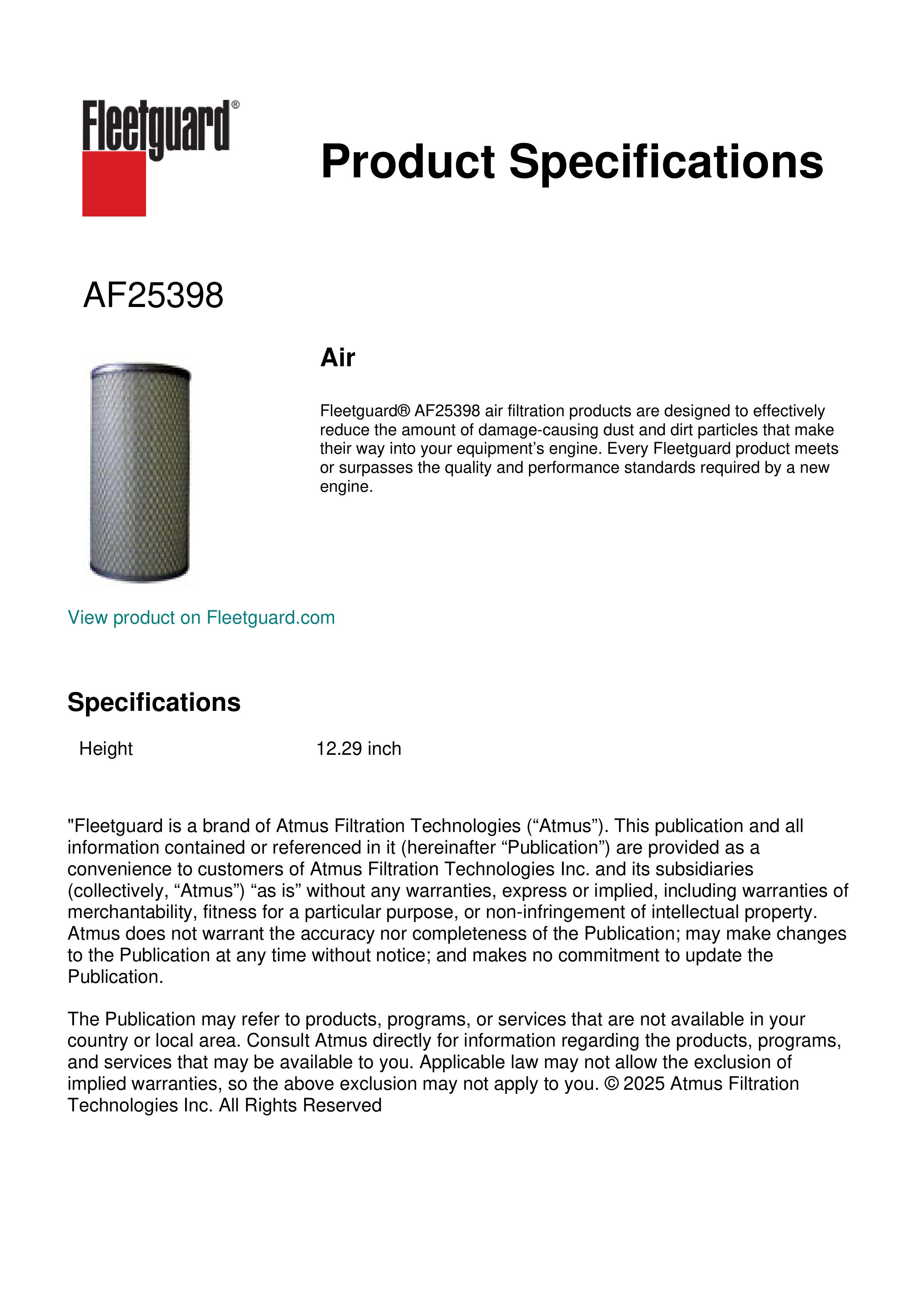Fleetguard® AF25398 air filtration products are designed to effectively reduce the amount of damage-causing dust and dirt particles that make their way into your equipment’s engine. Every Fleetguard product meets or surpasses the quality and performance standards required by a new engine.Specification