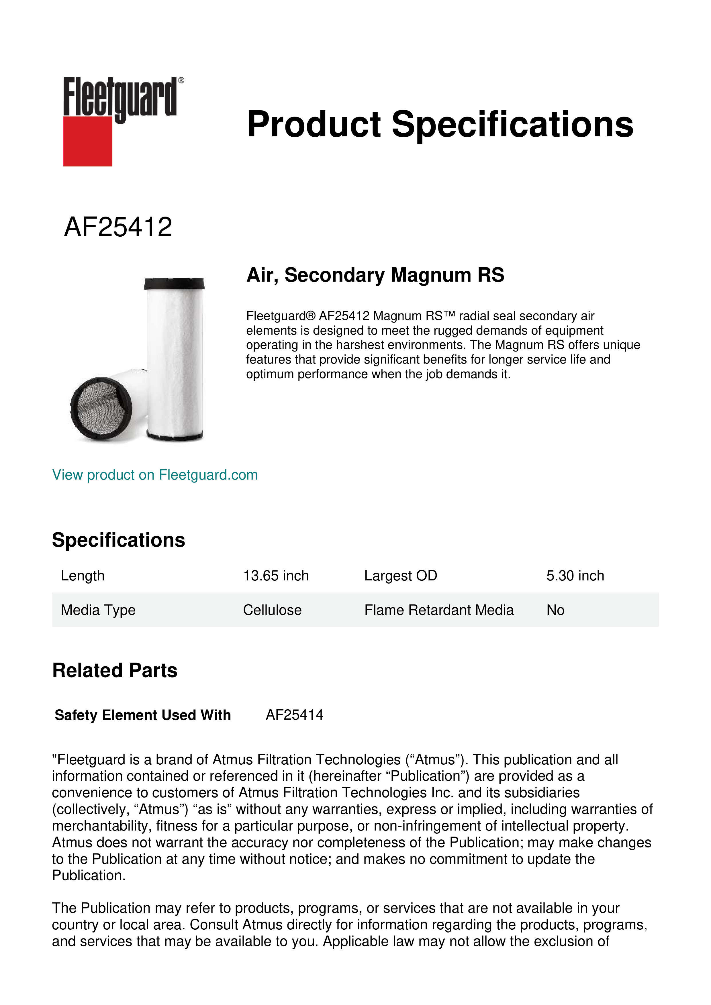 Fleetguard® AF25412 Magnum RS™ radial seal secondary air elements is designed to meet the rugged demands of equipment operating in the harshest environments. The Magnum RS offers unique features that provide significant benefits for longer service life and optimum performance when the job demands it.Specification