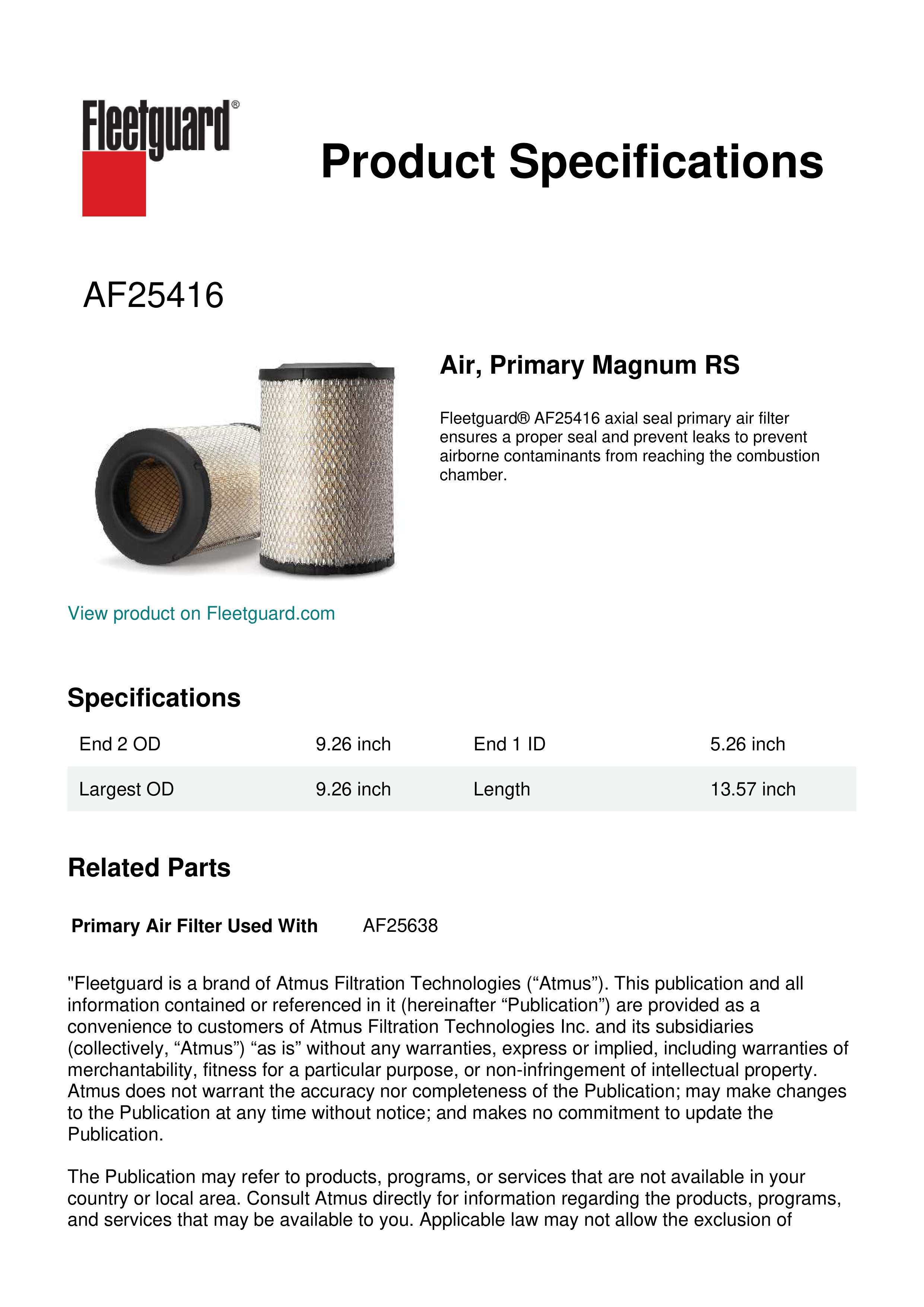 Fleetguard® AF25416 axial seal primary air filter ensures a proper seal and prevent leaks to prevent airborne contaminants from reaching the combustion chamber.