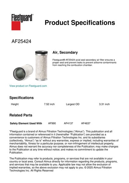 Fleetguard® AF25424 axial seal secondary air filter ensures a proper seal and prevent leaks to prevent airborne contaminants from reaching the combustion chamber.