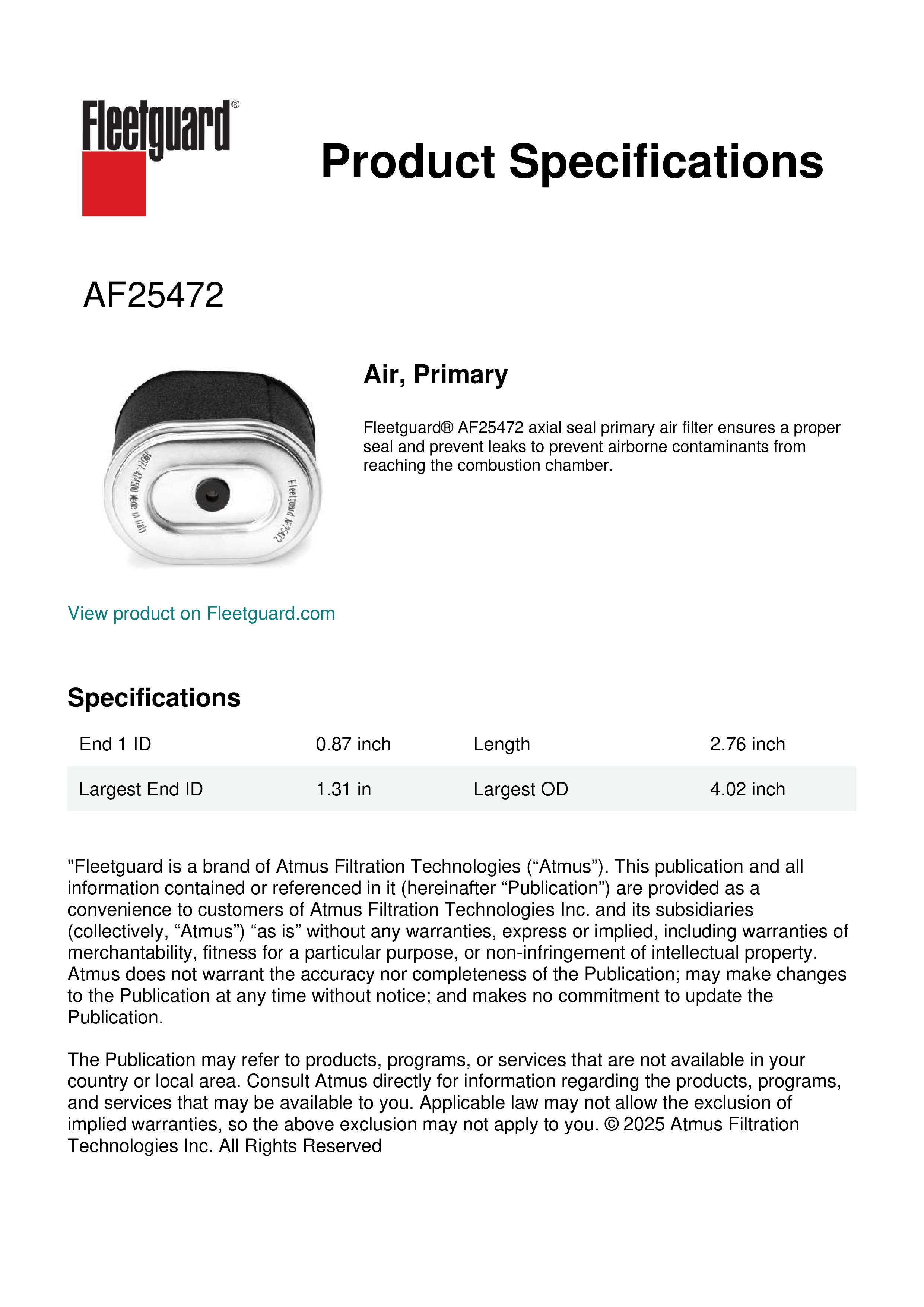 Fleetguard® AF25472 axial seal primary air filter ensures a proper seal and prevent leaks to prevent airborne contaminants from reaching the combustion chamber.
