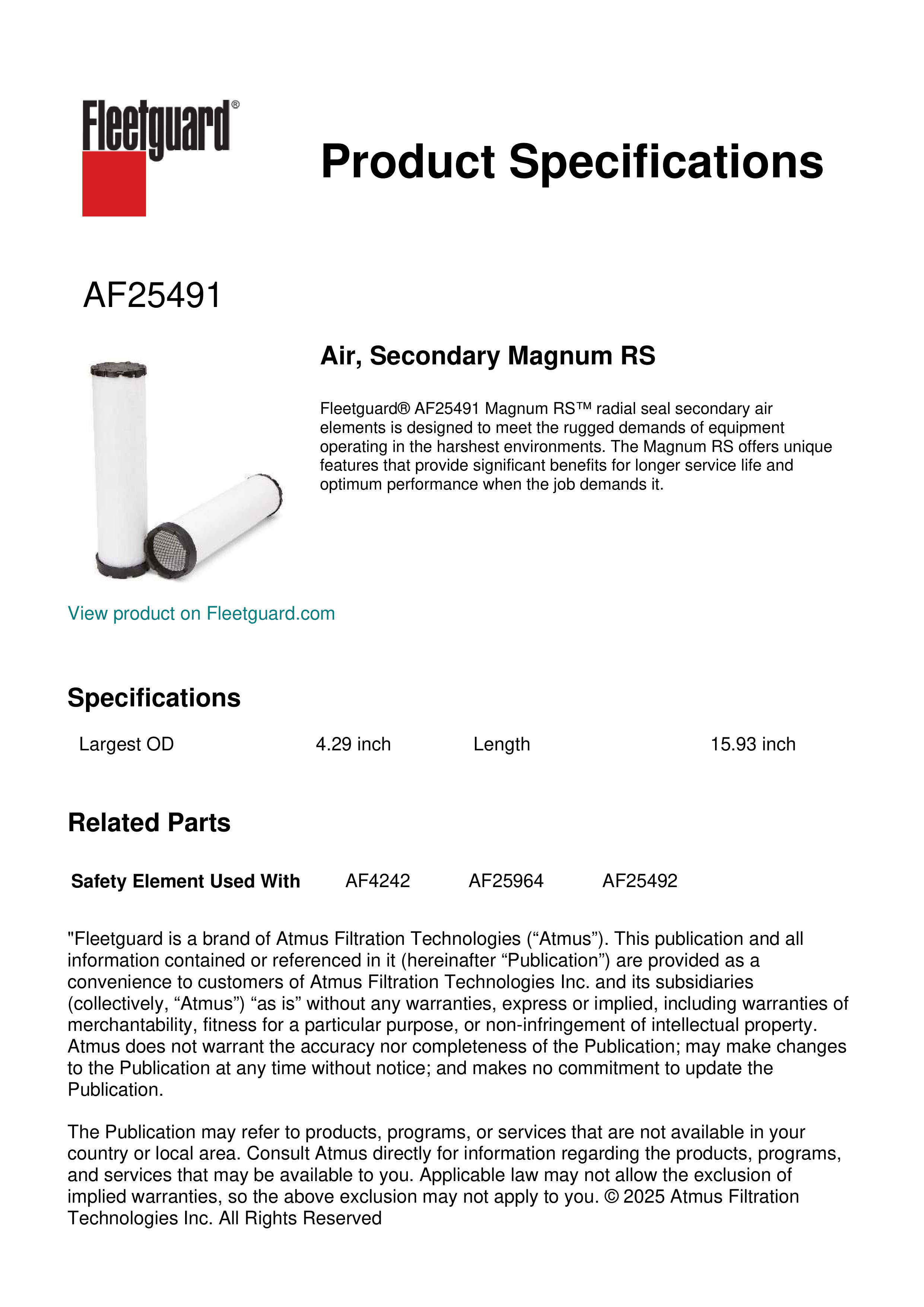 Fleetguard® AF25491 Magnum RS™ radial seal secondary air elements is designed to meet the rugged demands of equipment operating in the harshest environments. The Magnum RS offers unique features that provide significant benefits for longer service life and optimum performance when the job demands it.Specification