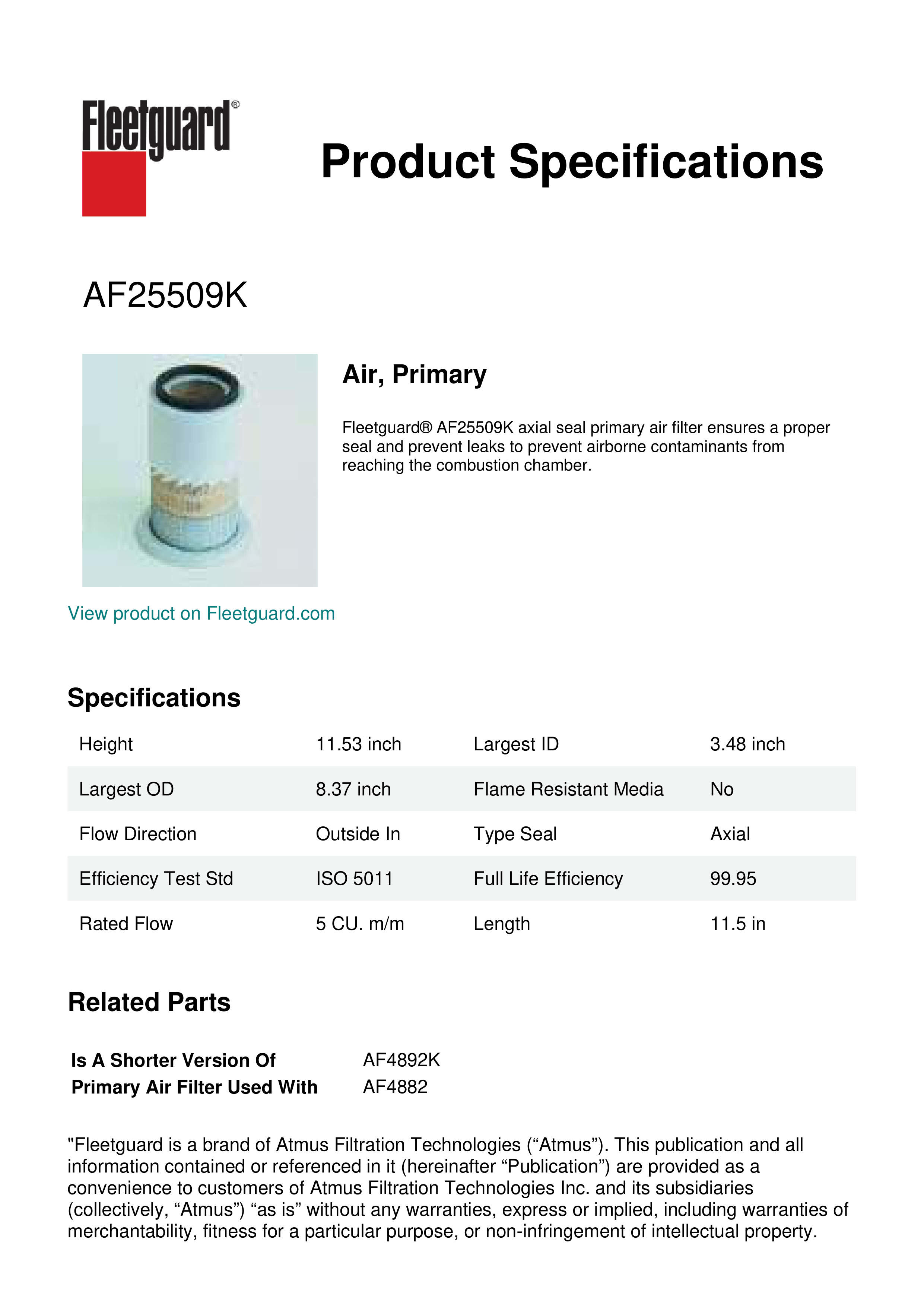 Fleetguard® AF25509K axial seal primary air filter ensures a proper seal and prevent leaks to prevent airborne contaminants from reaching the combustion chamber.Specification
