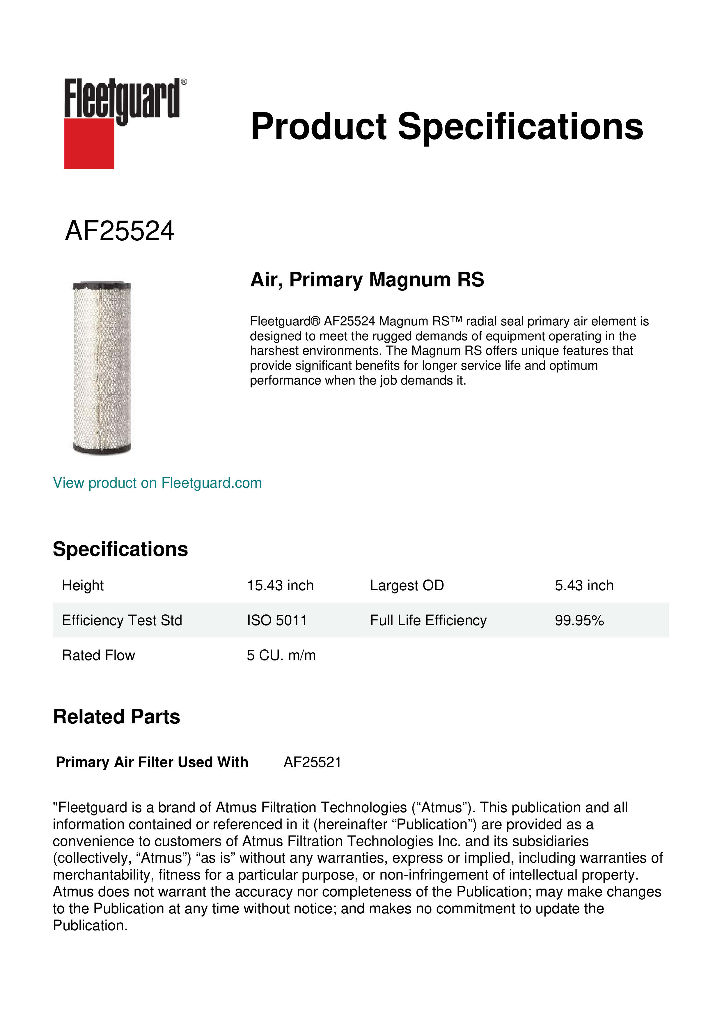Fleetguard® AF25524 Magnum RS™ radial seal primary air element is designed to meet the rugged demands of equipment operating in the harshest environments. The Magnum RS offers unique features that provide significant benefits for longer service life and optimum performance when the job demands it.Specification