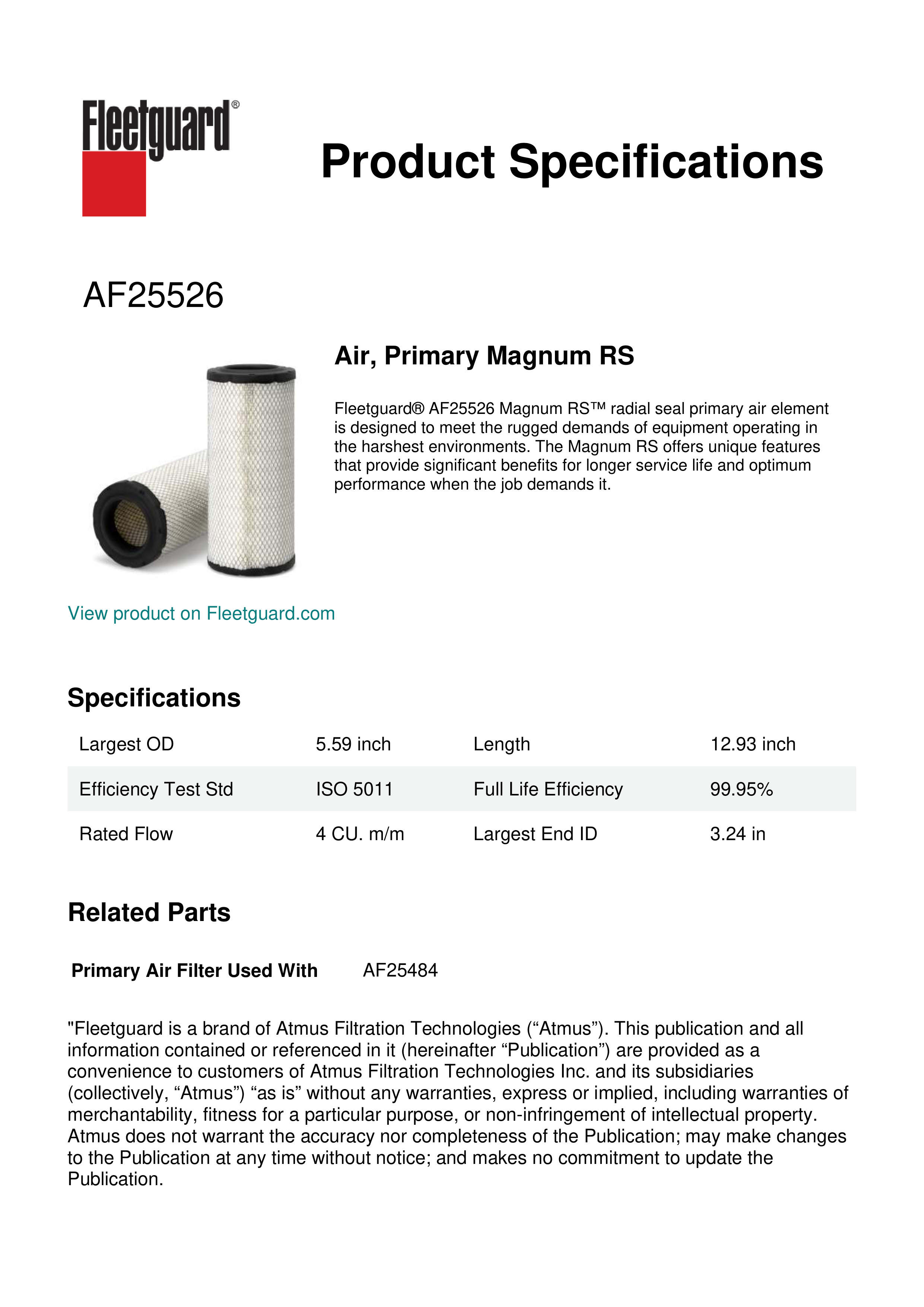 Fleetguard® AF25526 Magnum RS™ radial seal primary air element is designed to meet the rugged demands of equipment operating in the harshest environments. The Magnum RS offers unique features that provide significant benefits for longer service life and optimum performance when the job demands it.Specification