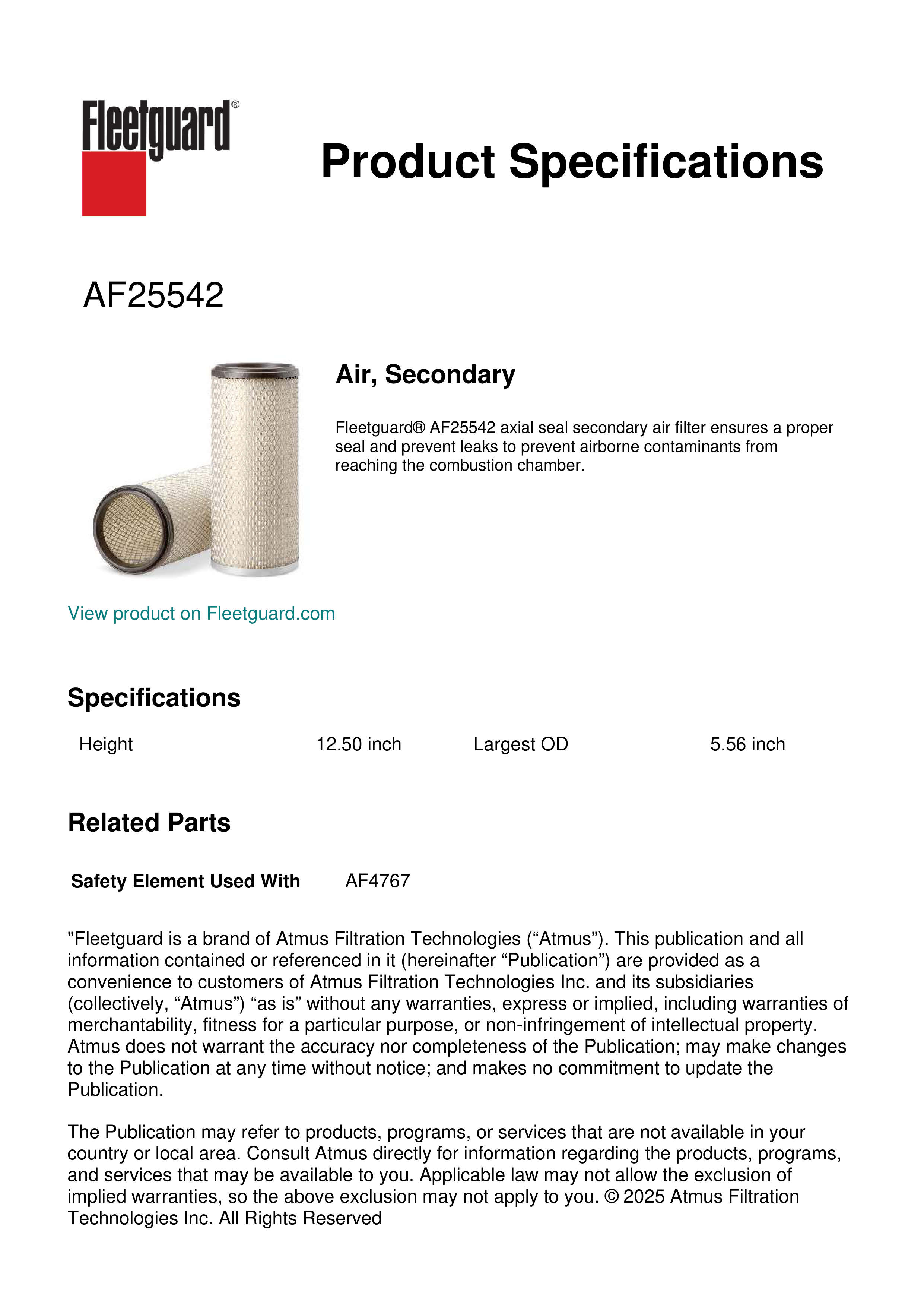 Fleetguard® AF25542 axial seal secondary air filter ensures a proper seal and prevent leaks to prevent airborne contaminants from reaching the combustion chamber.Specification
