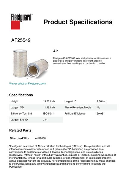 Fleetguard® AF25549 axial seal primary air filter ensures a proper seal and prevent leaks to prevent airborne contaminants from reaching the combustion chamber.