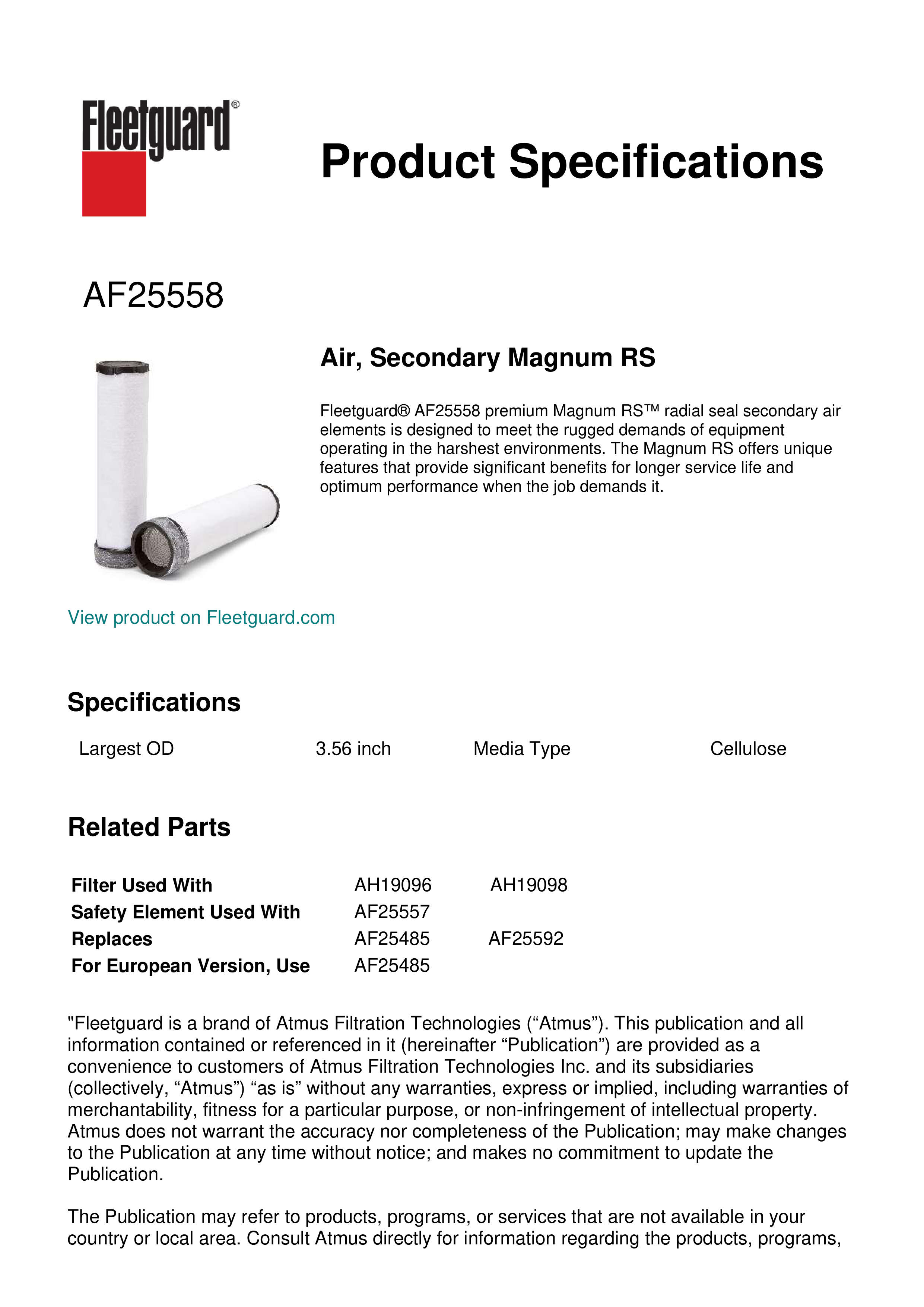 Fleetguard® AF25558 premium Magnum RS™ radial seal secondary air elements is designed to meet the rugged demands of equipment operating in the harshest environments. The Magnum RS offers unique features that provide significant benefits for longer service life and optimum performance when the job demands it.Specification