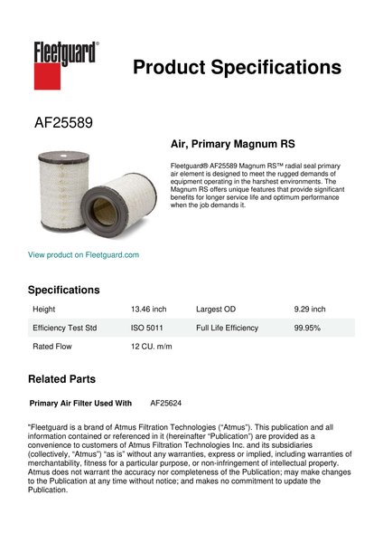 Fleetguard® AF25589 Magnum RS™ radial seal primary air element is designed to meet the rugged demands of equipment operating in the harshest environments. The Magnum RS offers unique features that provide significant benefits for longer service life and optimum performance when the job demands it.