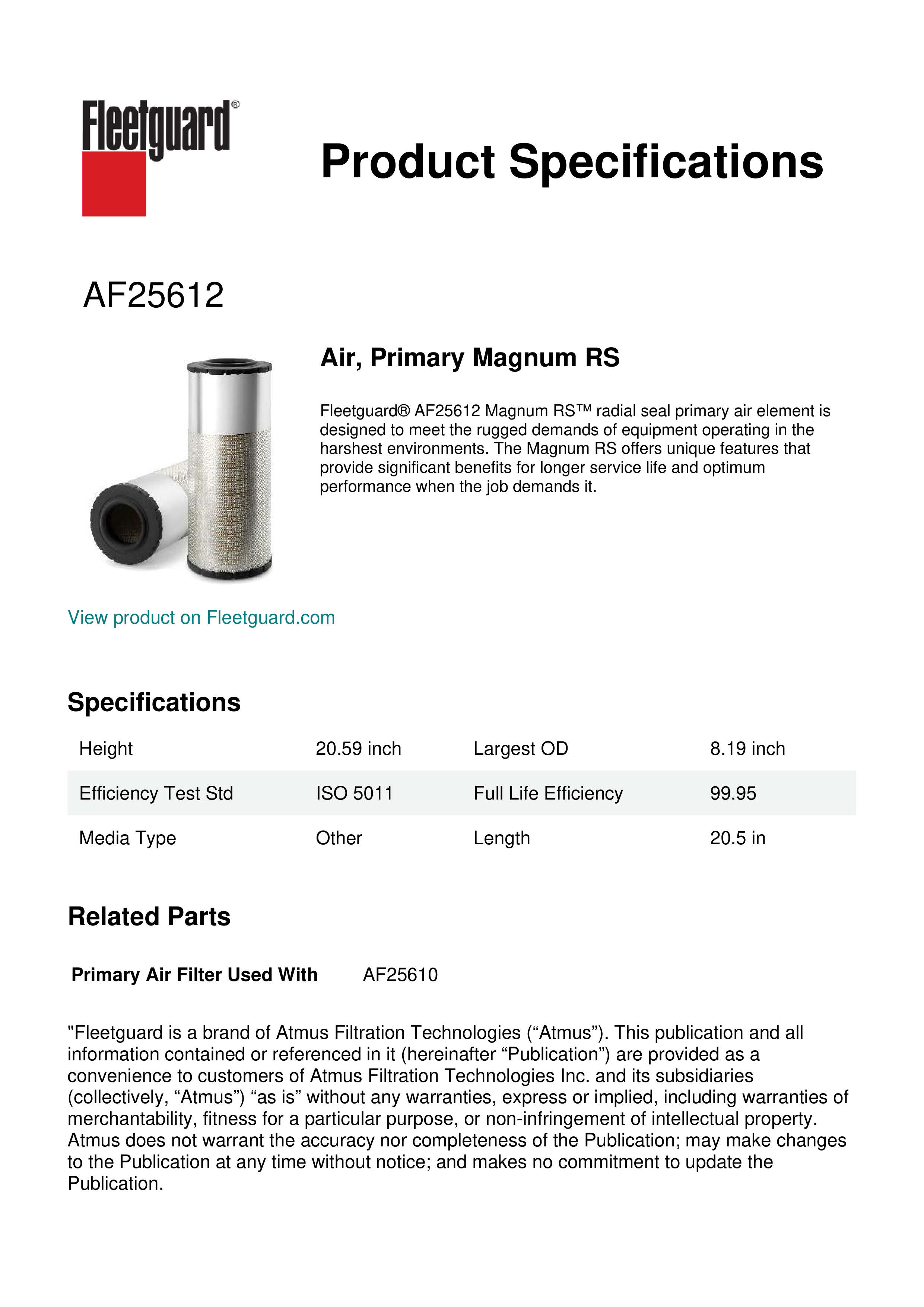 Fleetguard® AF25612 Magnum RS™ radial seal primary air element is designed to meet the rugged demands of equipment operating in the harshest environments. The Magnum RS offers unique features that provide significant benefits for longer service life and optimum performance when the job demands it.Specification