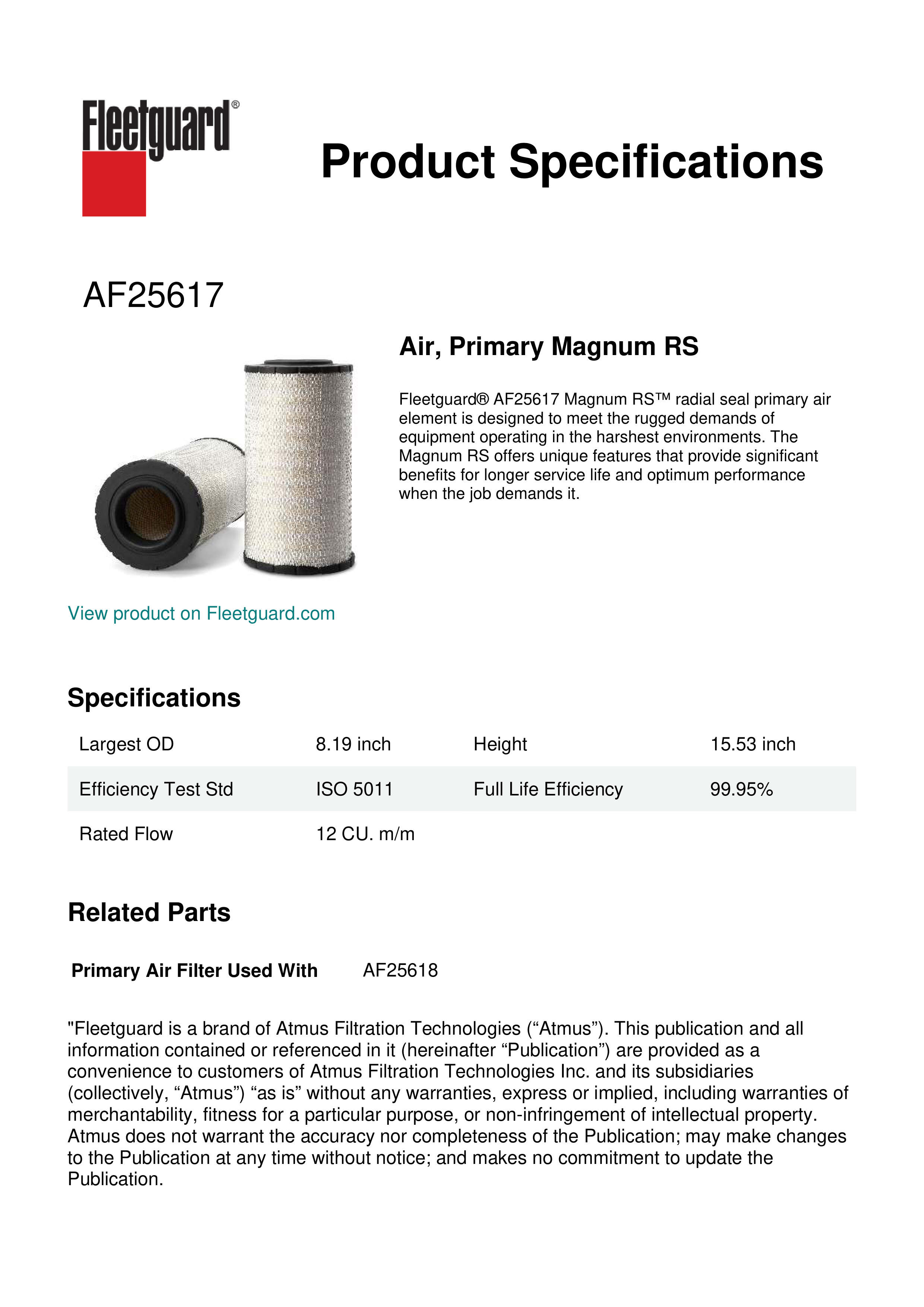 Fleetguard® AF25617 Magnum RS™ radial seal primary air element is designed to meet the rugged demands of equipment operating in the harshest environments. The Magnum RS offers unique features that provide significant benefits for longer service life and optimum performance when the job demands it.Specification