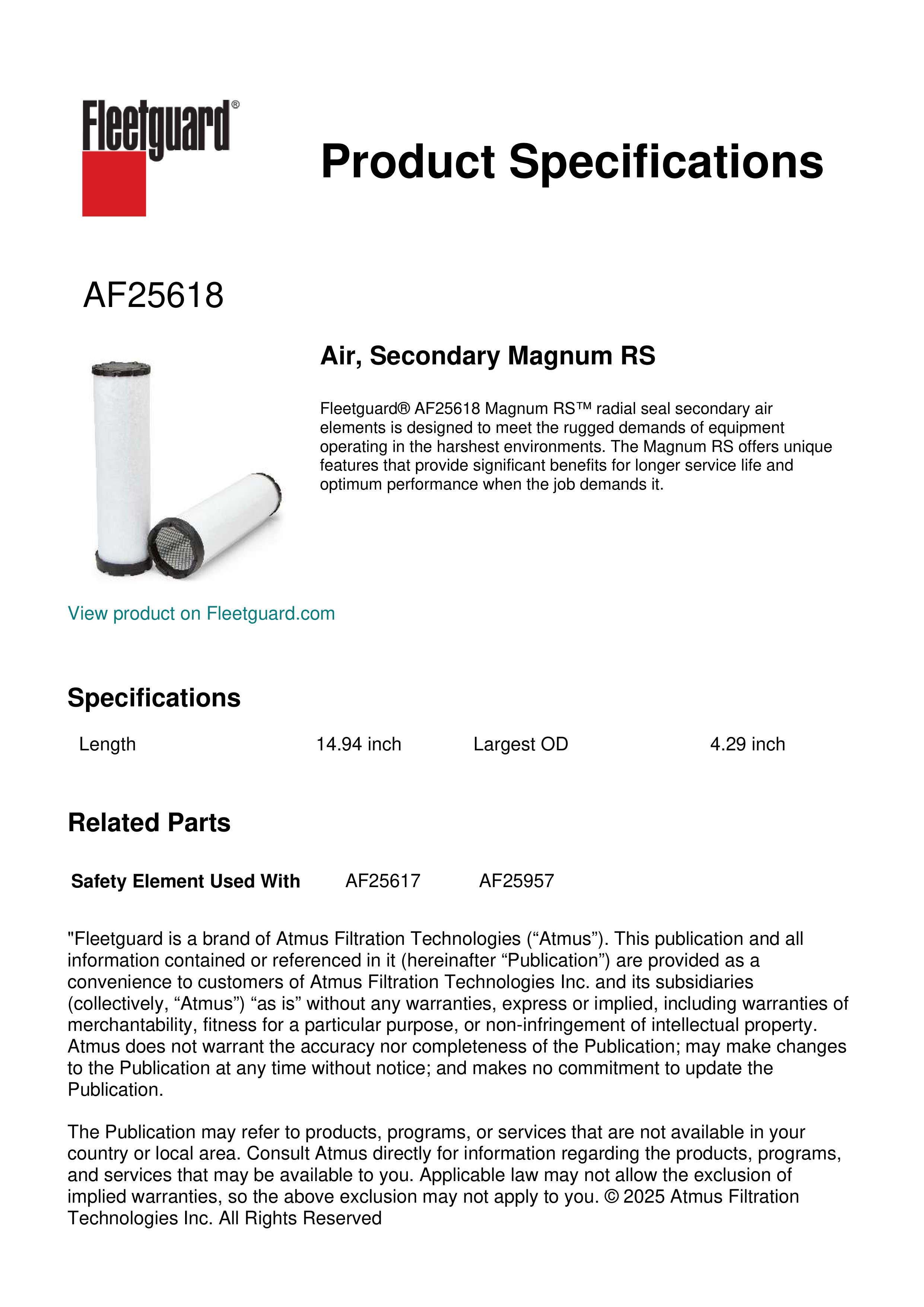 Fleetguard® AF25618 Magnum RS™ radial seal secondary air elements is designed to meet the rugged demands of equipment operating in the harshest environments. The Magnum RS offers unique features that provide significant benefits for longer service life and optimum performance when the job demands it.Specification