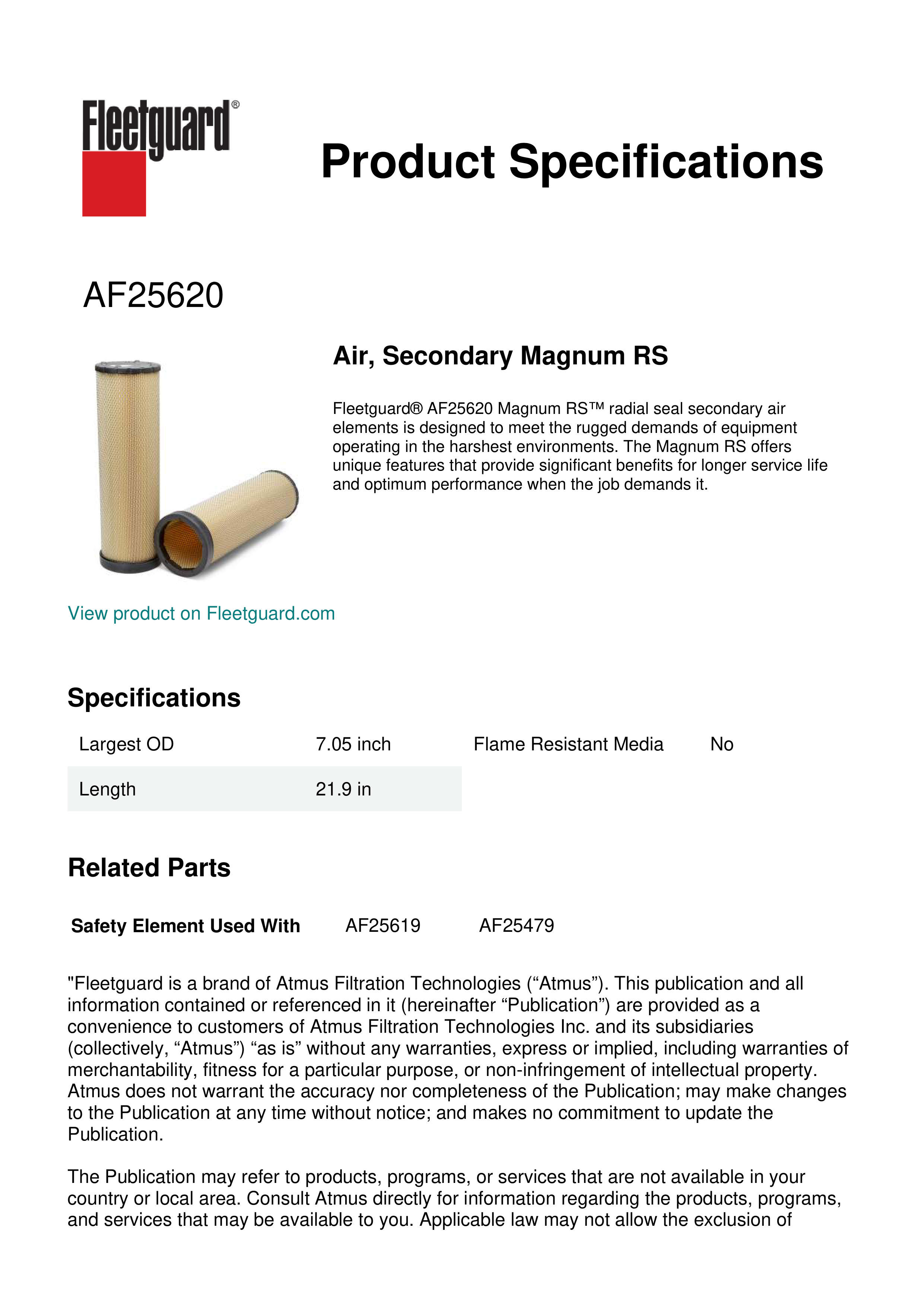 Fleetguard® AF25620 Magnum RS™ radial seal secondary air elements is designed to meet the rugged demands of equipment operating in the harshest environments. The Magnum RS offers unique features that provide significant benefits for longer service life and optimum performance when the job demands it.Specification